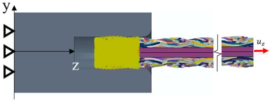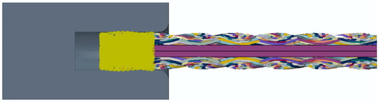 By assembling the finite element models of each component, the finite element model of the sling is obtained, as shown in Figure 8. To simulate the connection between the joint and the wire rope end, the segment of the rope residing within the joint’s cavity (indicated by the bright yellow region in Figure 9 is rigidly coupled to the joint body. This connection fully restrains all six degrees of freedom of the joint.