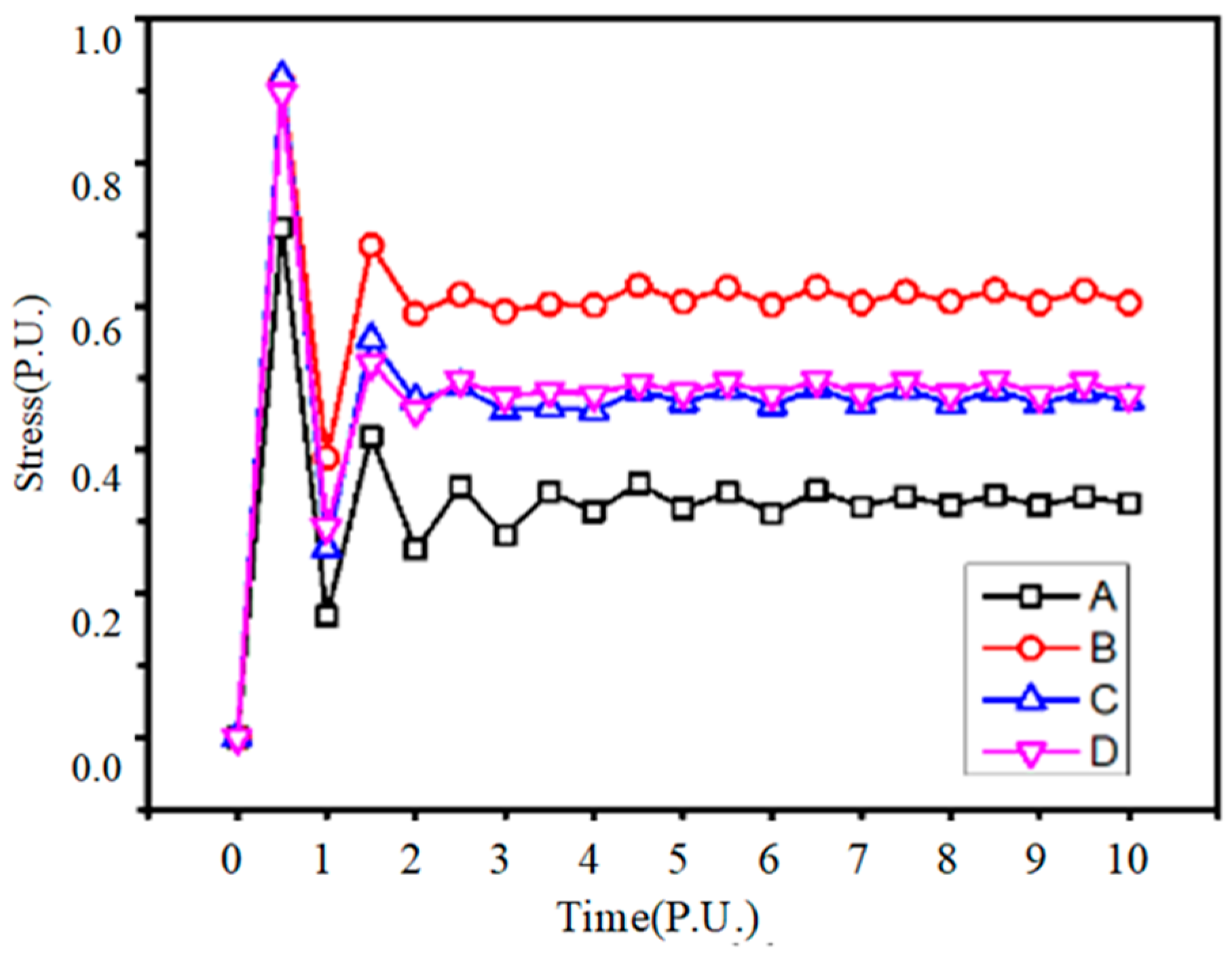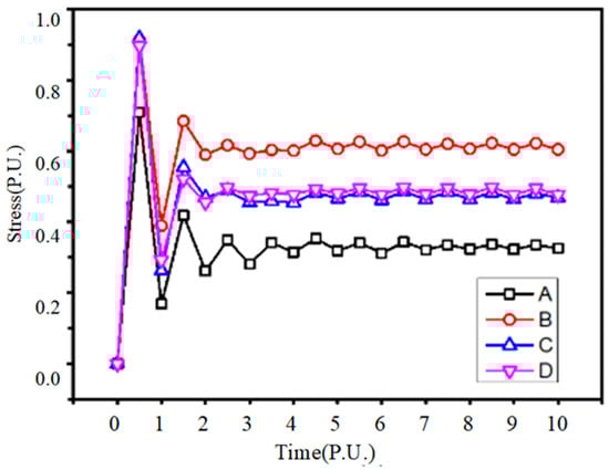 Further analysis of the stress evolution at locations A, B, C, and D (as indicated in Figure 12) during axial impact loading is presented in Figure 13. It was observed that upon impact, the stress in all wires increased abruptly. Among them, the maximum instantaneous stress of the inner layer, the second outer layer, and the core wire reached 0.93 P.U., which was 1.5 times the maximum stress of the steel wires in the stable state. Moreover, the steel wires underwent yielding before reaching the stable state. With the continuous loading, the stress of the steel wires in the corresponding area decreased rapidly and stabilized. This indicates that the impact load is an important form of load causing damage to the rigging.