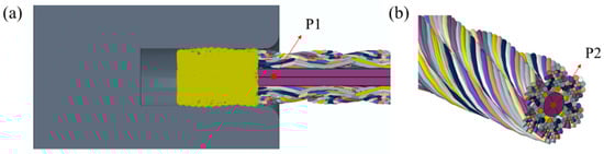 For the tension bending load of the rigging, the method of decoupling tension and bending loads is adopted. In this method, the joint end and the axial impact loading are the same. The joint and the steel wire rope inside the joint are subject to rigid constraints, and all nodes are constrained to the center point of the end face close to the steel wire rope direction (P1); the end face node of the steel wire rope is constrained to the center point of the end face (P2), as shown in Figure 13. The combined tension-bending loading is applied in two time steps. During the tension application stage, all constraints are applied at point P1, and an axial impact load of 4 P.U. is applied at point P2. During the bending application stage, the tension at point P2 remains constant, and a bending load is applied at point P1 (where the object rotates 1 P.U. around the Z-axis).
