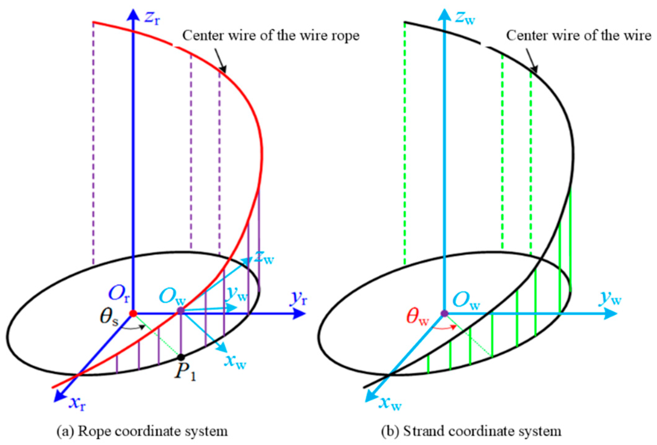 First, establish the right-angled coordinate system CSOr on the cross-section of the steel wire rope, as shown in Figure 2a, with the coordinate origin Or (fixed) located at the center of the cross-section of the steel wire rope, the coordinate axis zr coinciding with the axis line of the steel wire rope and pointing upwards in the positive direction, and the coordinate plane xrOryr used to measure the helical angle θs of the wire strand. Then establish the local coordinate system CSOw as shown in Figure 2b, with the coordinate origin Ow (movable) located on the central line of the wire strand, as shown in Figure 2a. P1 is the projection of Ow on the xrOryr plane, the direction of the coordinate axis zw is consistent with the tangent direction at point Ow on the central line of the wire strand, the positive direction of zw is the direction of the helix ascent; the coordinate plane xwOwyw is used to measure the helical angle θw of the steel wire, xwOwyw is perpendicular to the zw axis.