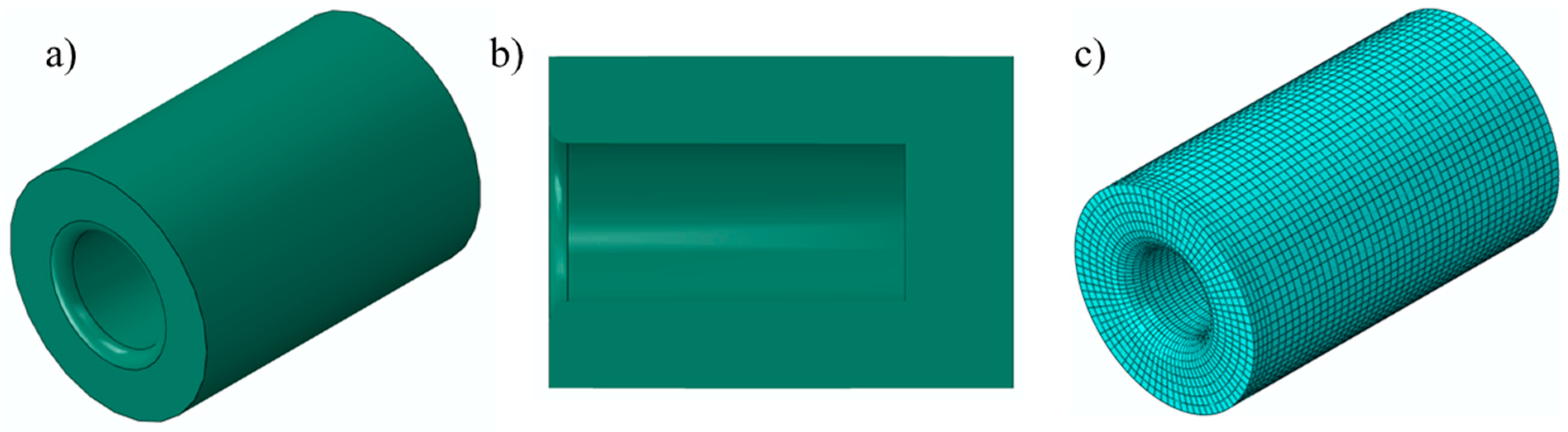 The three-dimensional models of the strands were arranged in a helical pattern to generate all six strand assemblies. The core was geometrically represented as a cylindrical body, leading to the complete three-dimensional solid model of the wire rope, illustrated in Figure 6a. Based on the structure of the steel wire rope, the finite element mesh is divided using the sweeping method, and the element type is selected as C3D8R. The length of the steel wire rope is set to 1 m. Each steel wire and the rope core are distributed along the circumference of the cross-section. The overall distribution density of the mesh is controlled at 5 mm, and the minimum mesh size is controlled at 0.1% of the global size. The mesh model of the entire steel wire rope is shown in Figure 6b.