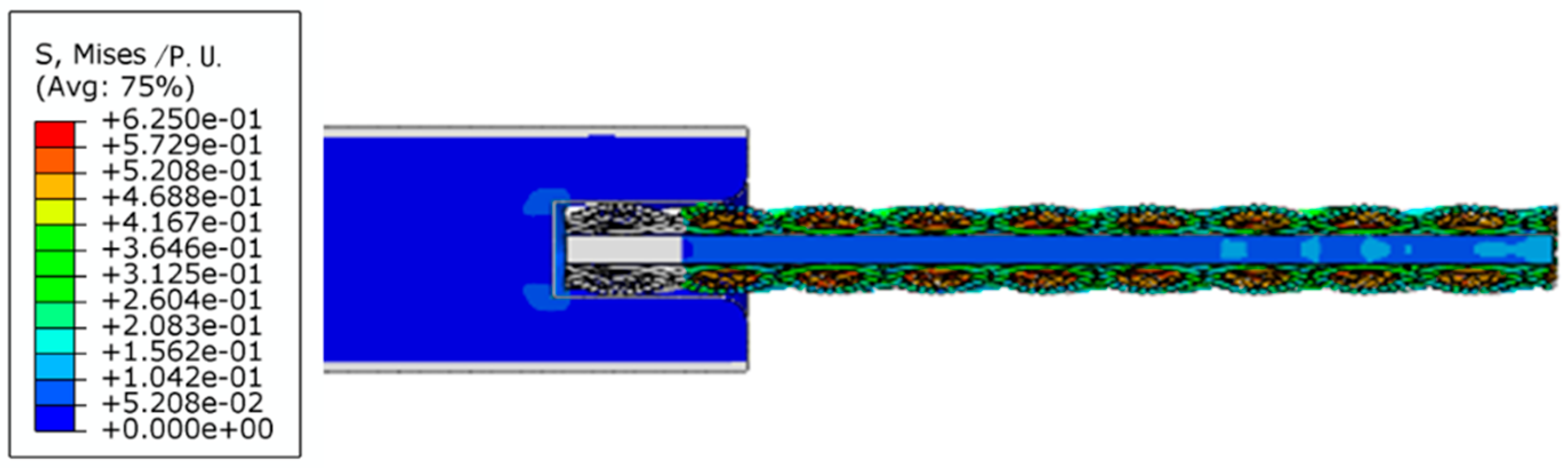 - Under axial impact load (4 P.U.), the steel wire at the root of the joint reaches the stress peak instantaneously under the impact action. Among them, the core, inner layer, and secondary outer layer steel wires have already yielded, and their local maximum stress reaches 0.93 P.U. However, the peak stress lasts for a very short time and then decreases and tends to stabilize. After the loading becomes stable, the maximum stress in the rope is found on the secondary outer layer steel wire at the root of the joint, with a maximum stress of 0.62 P.U., which is only 67% of the maximum peak stress. At this time, the stress is approximately fan-shaped distribution on the cross-section of the rope strands.