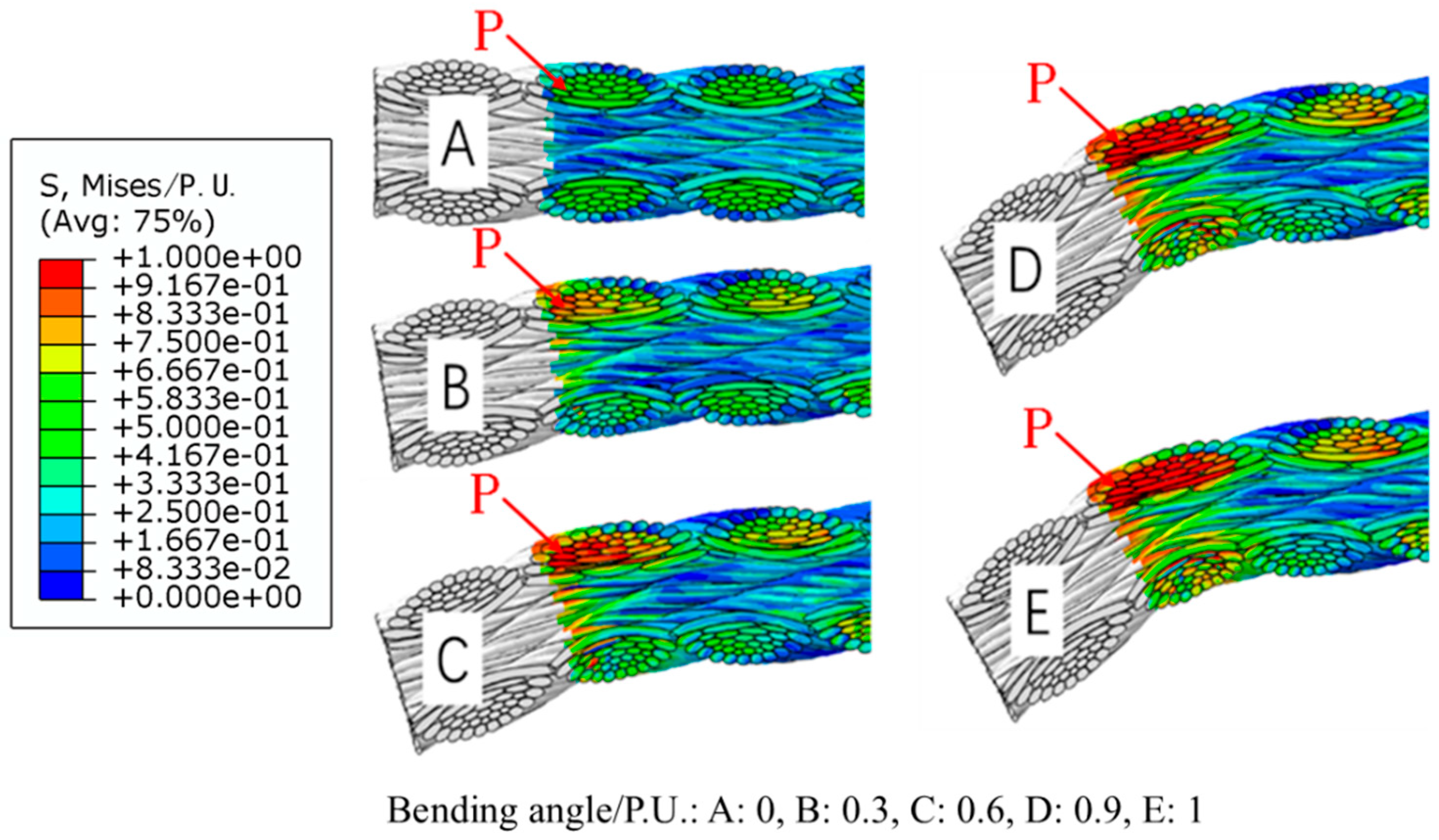 - Comparing the axial impact and the simulated bending wave tension-bending loading conditions, the dangerous areas of both are located on the secondary outer layer steel wire at the root of the joint. Under the axial impact load, the maximum peak stress is 0.93 P.U., and after the combined tension-bending load, the maximum stress increases to 0.97 P.U., an increase of 1.04 times.