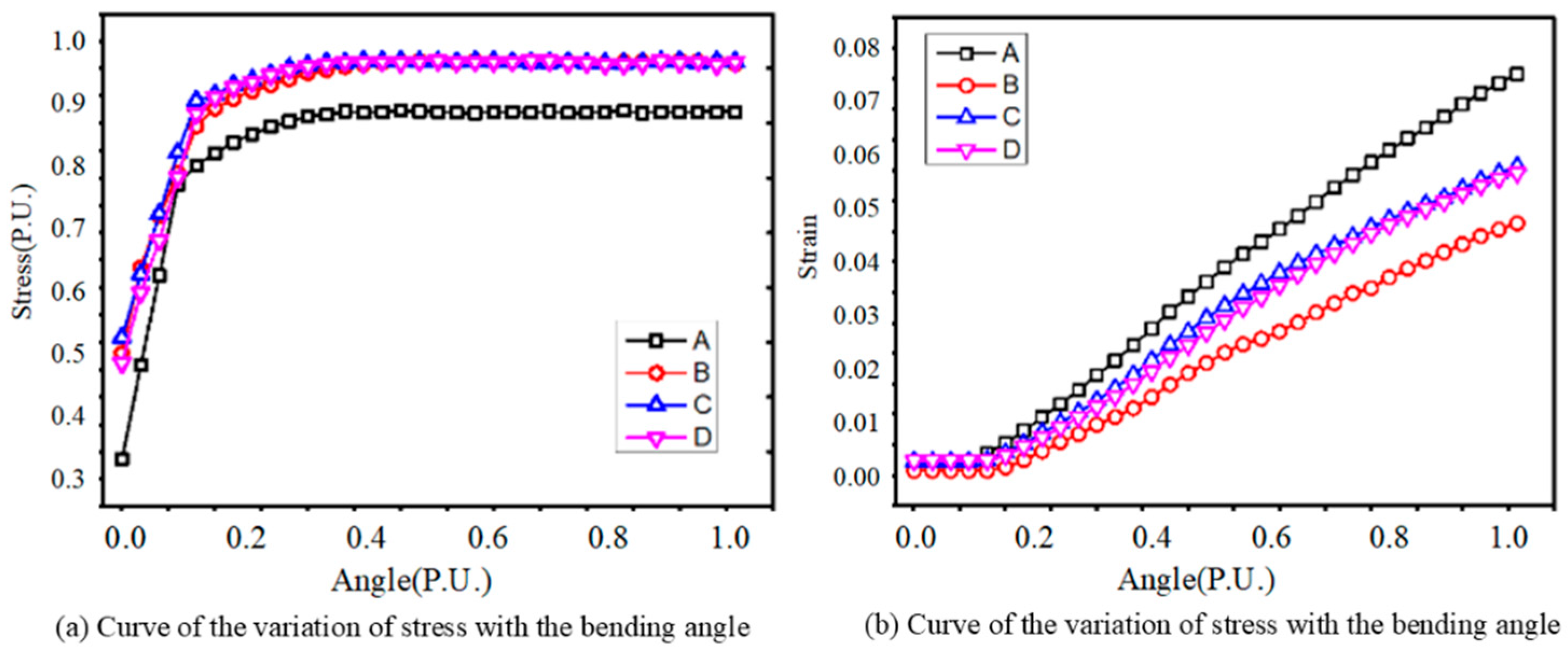 The curves showing the stress and strain of each layer of steel wires on the tensioned side of the joint root in Figure 14 (the steel wire at point P in the figure) as a function of the bending angle are shown in Figure 15.