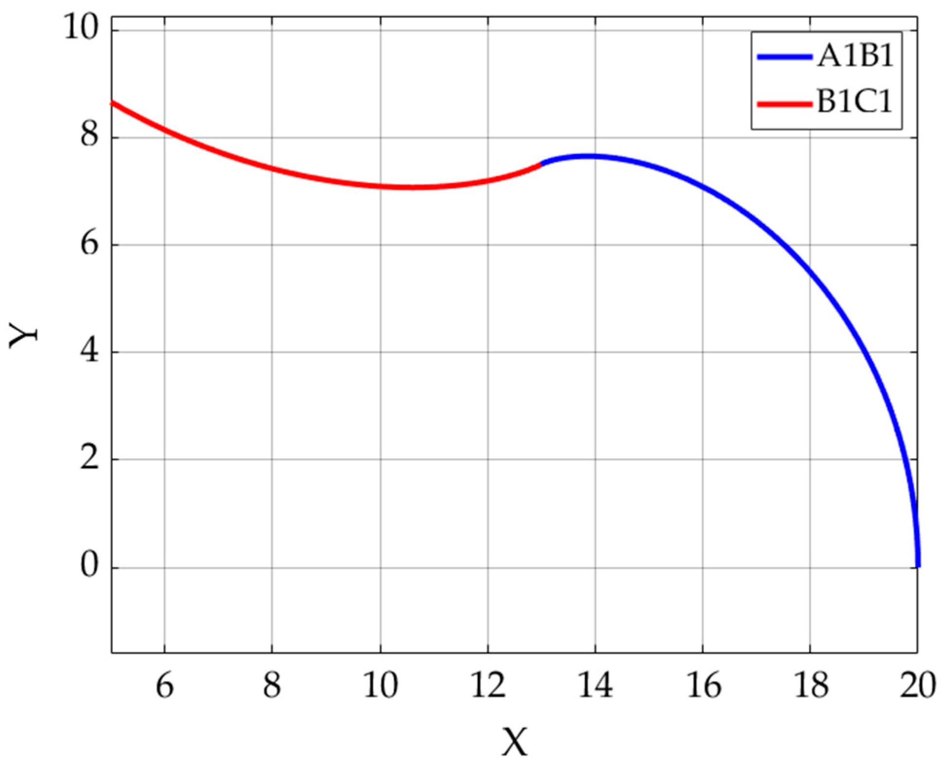 For the calculation of the coordinates of the points on the epicycloidal arc , Equation (11) was used, and for the coordinates of the points on the hypocycloidal arc , Equation (13) was applied.