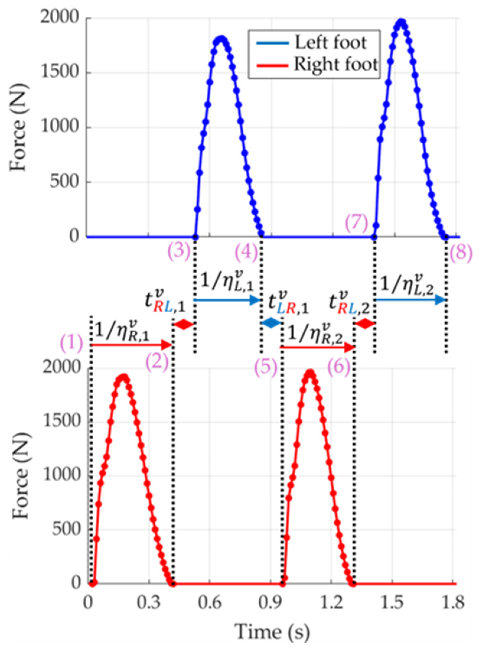 - The independent modelling of each foot’s GRF, capturing gait’s inherent variability across feet. In this regard, vertical GRFs were analyzed, and the resultant total action was evaluated at the end. The approach could be extended to other force components with adjustments not addressed here;