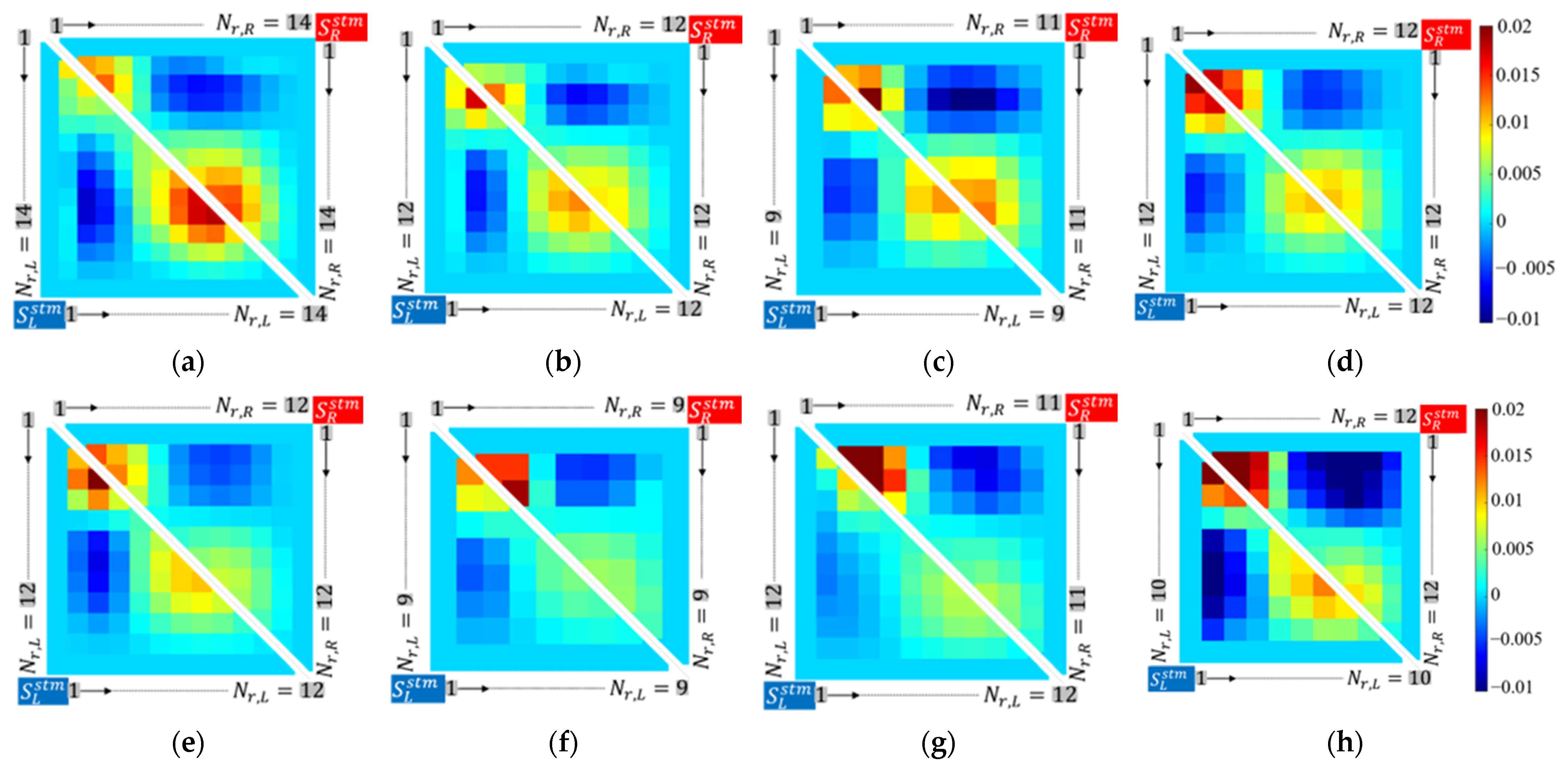 - Two mean vectors, and , and their unbiased covariance matrices, and . These were obtained from computing the subset, centered, and rescaled GRF matrices in Equation (13) and applying the expression given in Equation (14), where stands for . This accounted for each foot’s step pattern after its description had been reduced in Section 2.4. Each of the corresponding interpolation points was assumed to follow a normal distribution, with all the points collectively following multivariate normal distributions, denoted as and .