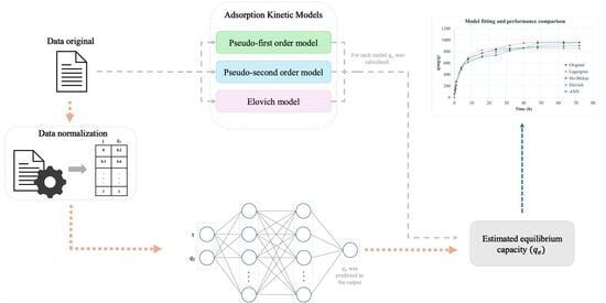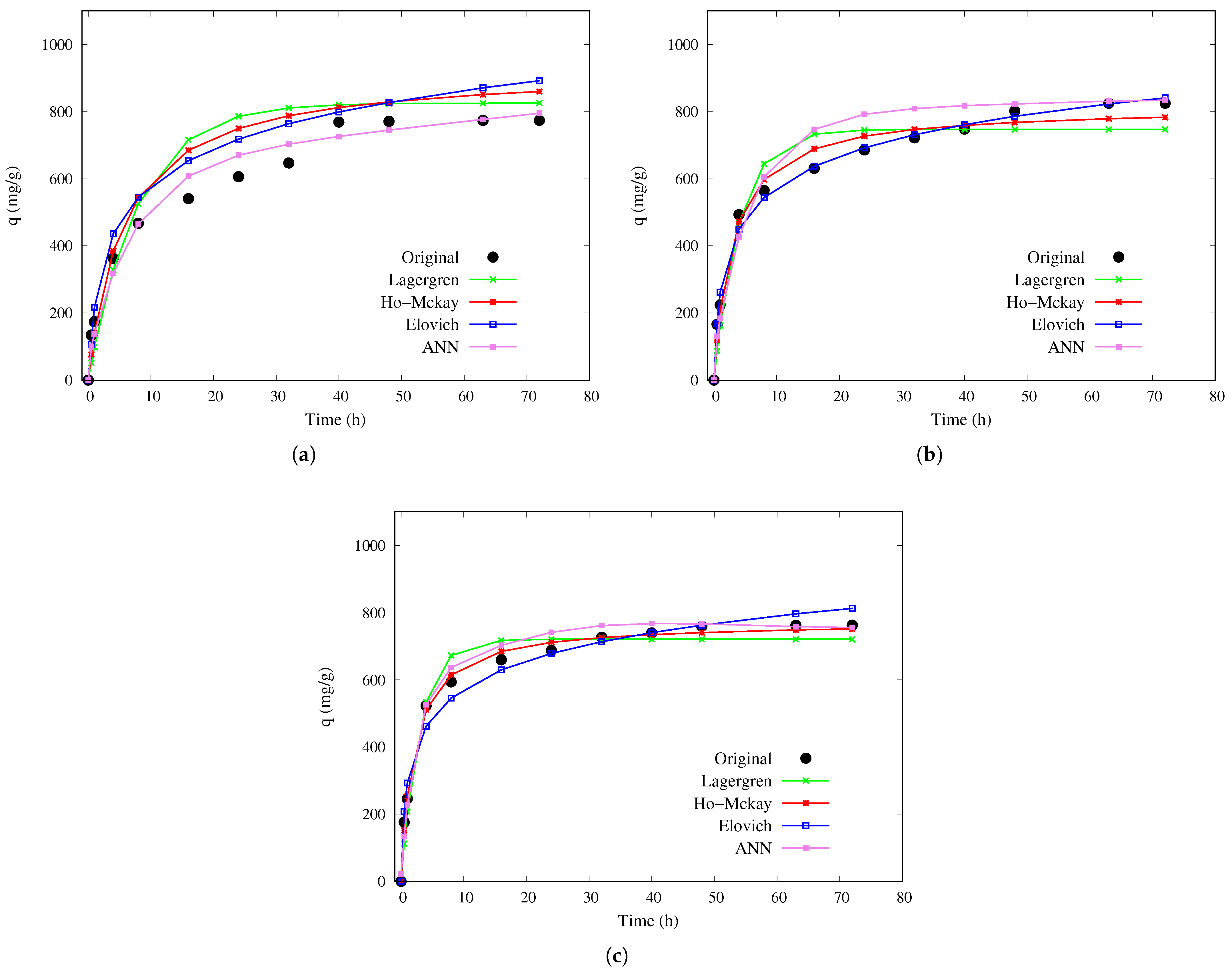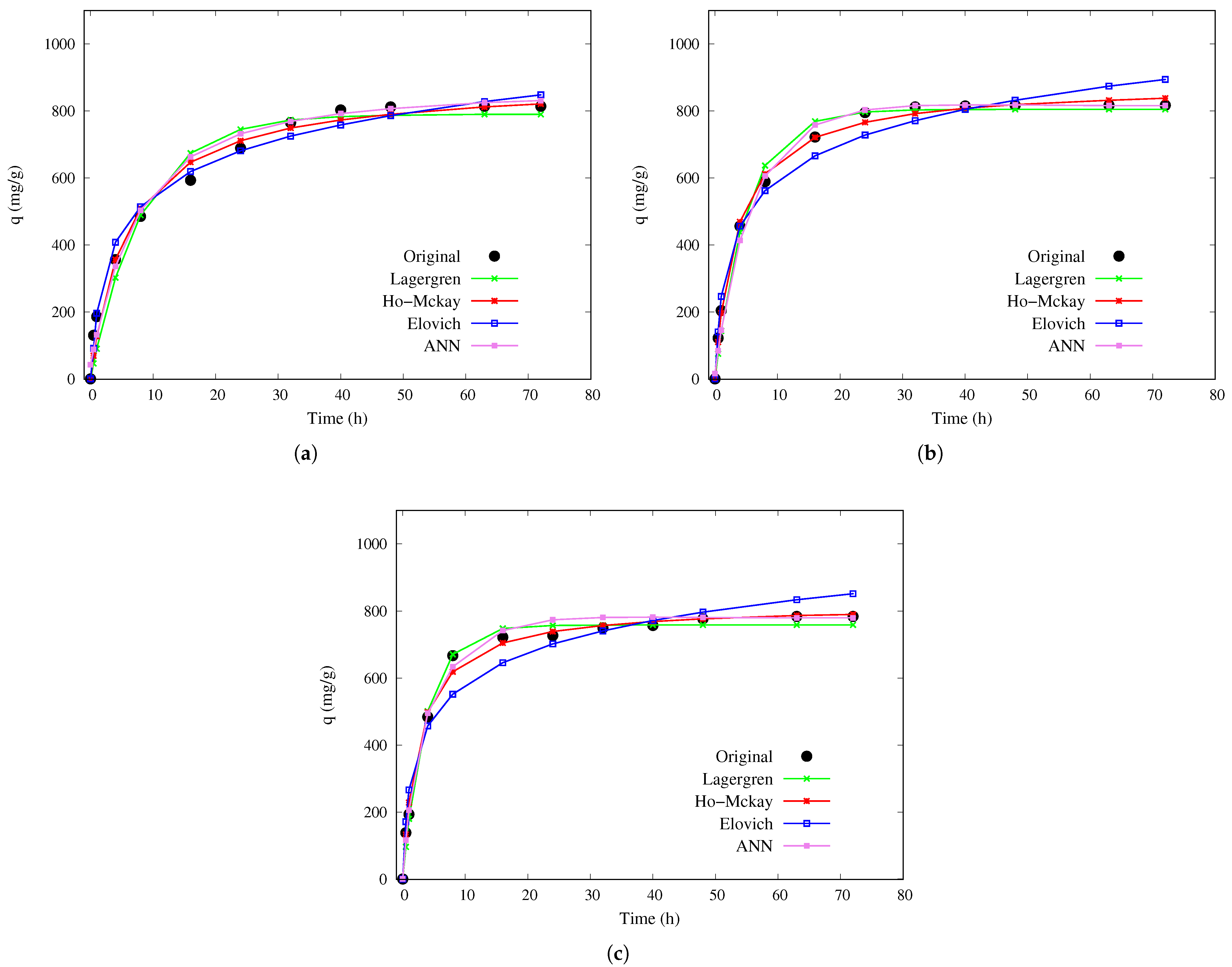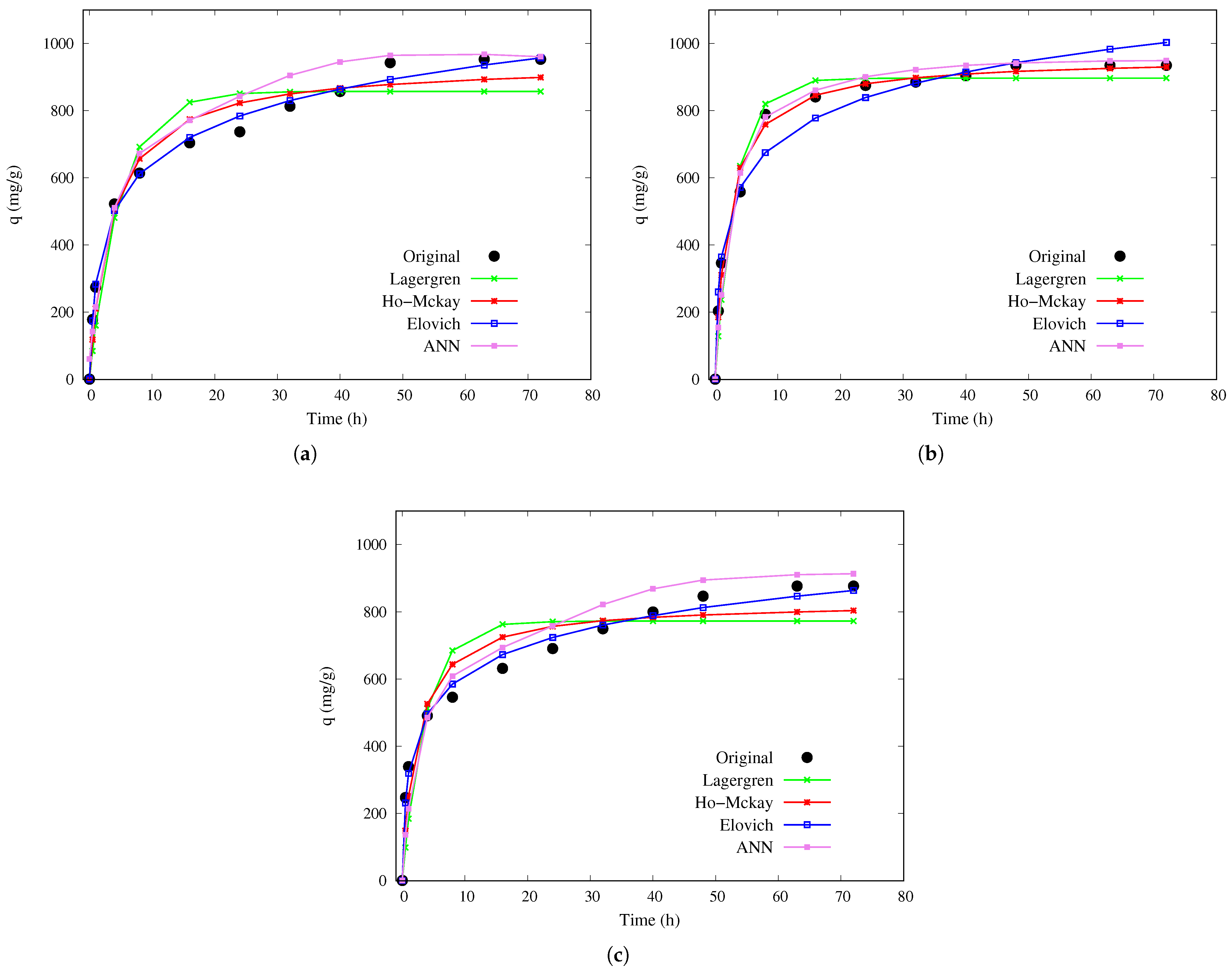 The results show that the ANN achieves high predictive accuracy () and significantly shortens the estimated time to reach equilibrium, ranging from 32 to 63 h, compared to over 72 h for traditional kinetic models. This improved efficiency, along with the ANN’s ability to incorporate multiple process variables, demonstrates its potential as a reliable and practical tool for optimizing adsorption processes, reducing experimental time. These benefits are also evident in the graphical analyses, where the ANN consistently provided a closer fit to the experimental data across all tested bead sizes and temperatures.