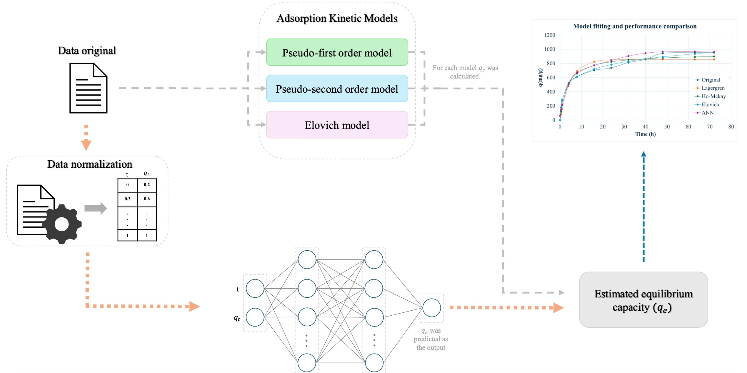 Artificial neural networks (ANNs) have attracted attention for their ability to model complex, nonlinear relationships without requiring explicit physical equations. Unlike traditional kinetic models (e.g., pseudo-first-order, pseudo-second-order or Langmuir and Freundlich isotherms), which depend on simplified assumptions, ANNs can incorporate multiple variables, including pH, temperature, contact time, initial concentration, and adsorbent dose, to deliver accurate predictions [