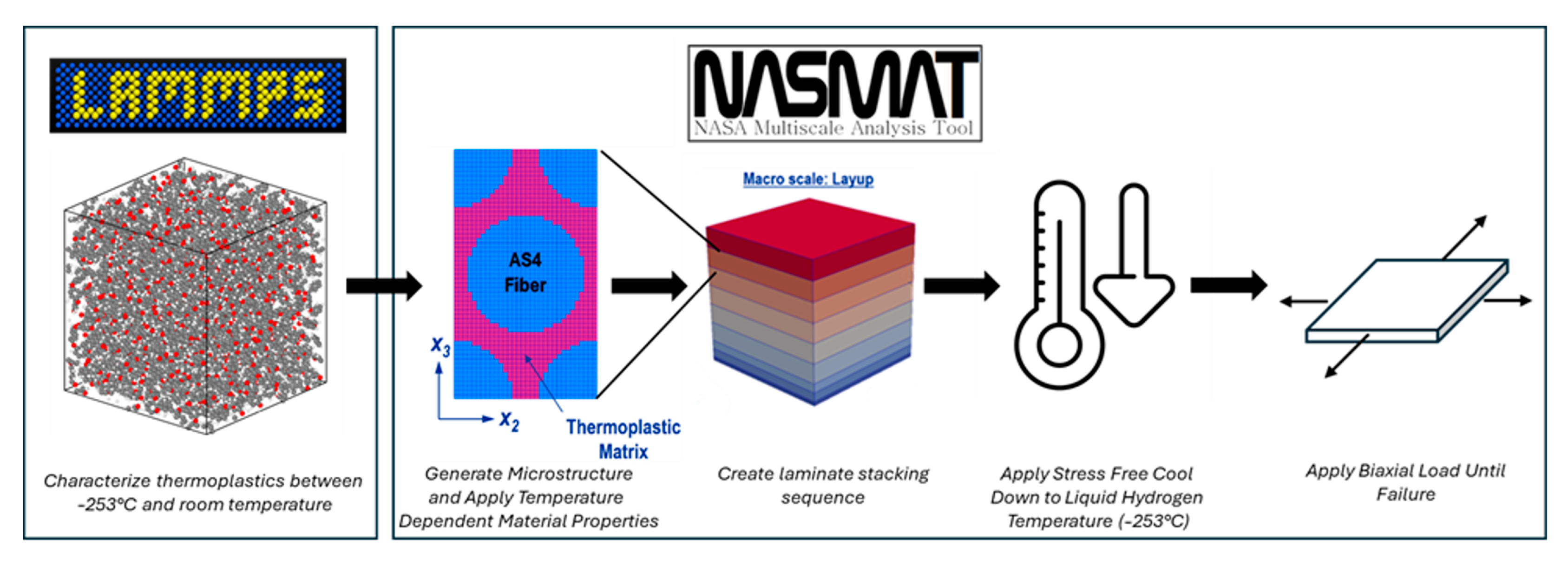 The nano-scale MD thermoplastic property predictions are used as input to a multiscale micromechanics model considering both the micro (fiber/matrix) and macro (ply layup) scales in a coupled manner. This enables the capture of residual stresses at the fiber/matrix constituent scale, which then influences the progressive damage predictions during the applied mechanical loading. The result is a realistic evaluation of promising thermoplastic matrix materials for use in linerless TPC cryogenic tanks.