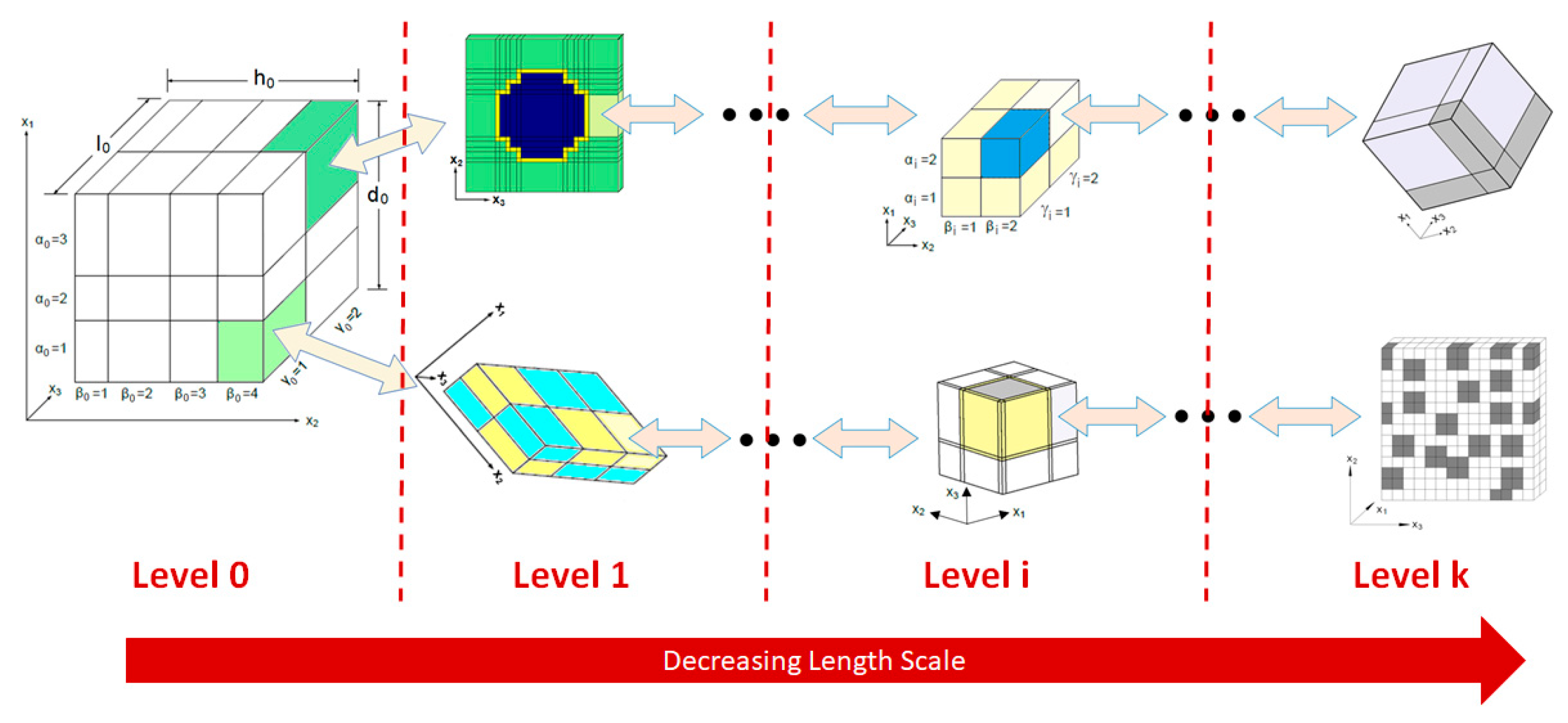 In multiscale recursive micromechanics (MsRM), synergistic material modeling is achieved by linking scales such that the homogenized response of a representative unit cell (RUC) at scale