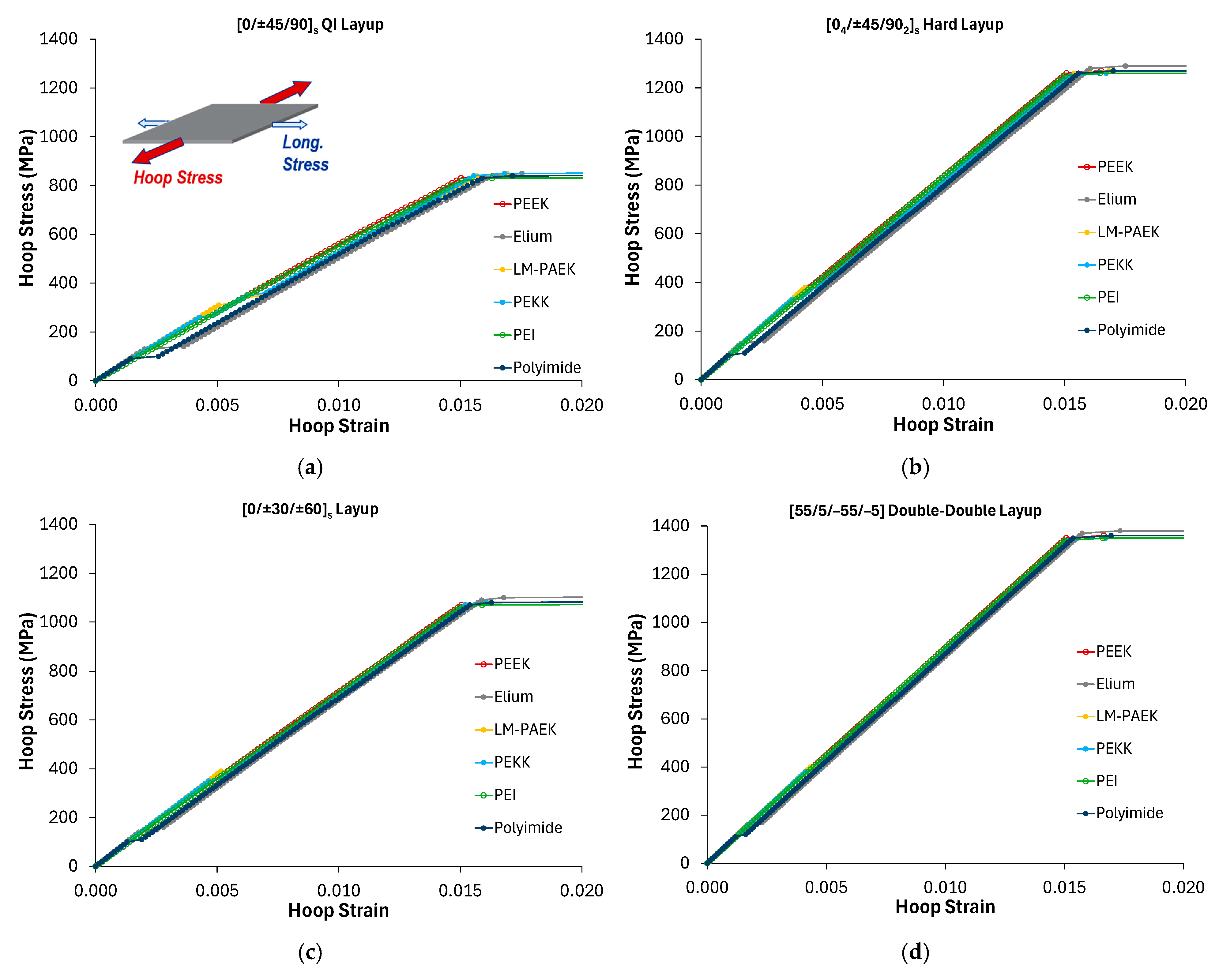 Figure 5 presents the hoop stress–hoop strain responses for each of the four layups, quasi-isotropic [0/±45/90]