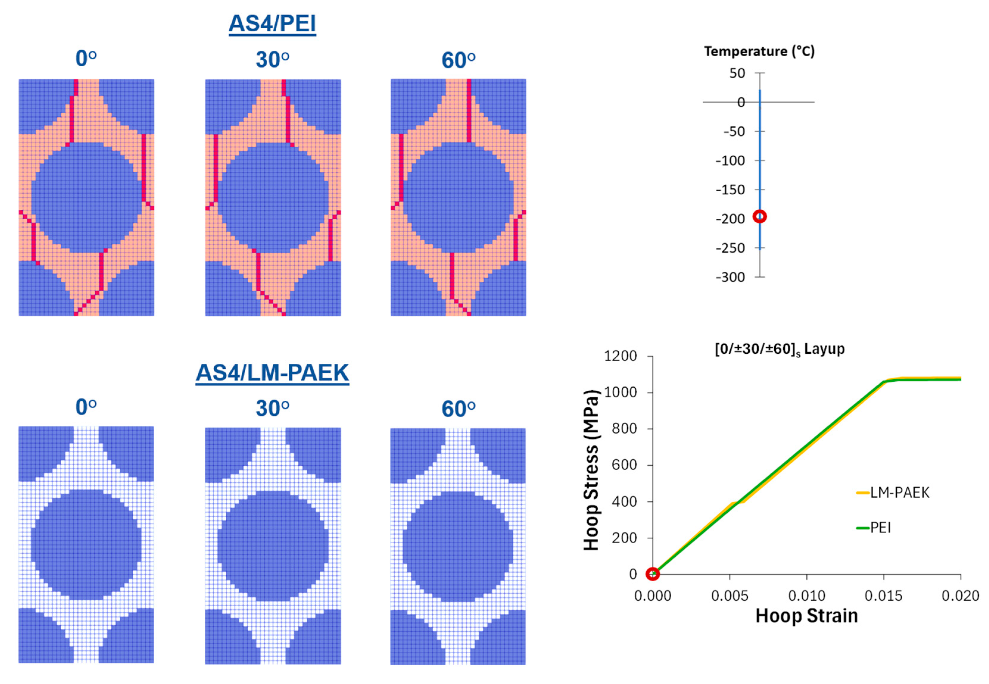 s, and the Double-Double configuration, and the six thermoplastic matrices. In all cases, the onset of matrix damage manifests as sudden strain jumps under stress control, serving as a proxy for microcrack initiation and, by extension, potential permeability. While the ultimate burst stress (associated with fiber failure) was similar across materials and layups, the predicted damage initiation stresses varied widely. Notably, the PEEK and PEI matrix composites exhibited microcracking during cooldown, prior to any mechanical loading, indicating poor cryogenic performance for these thermoplastic systems compared to the others.