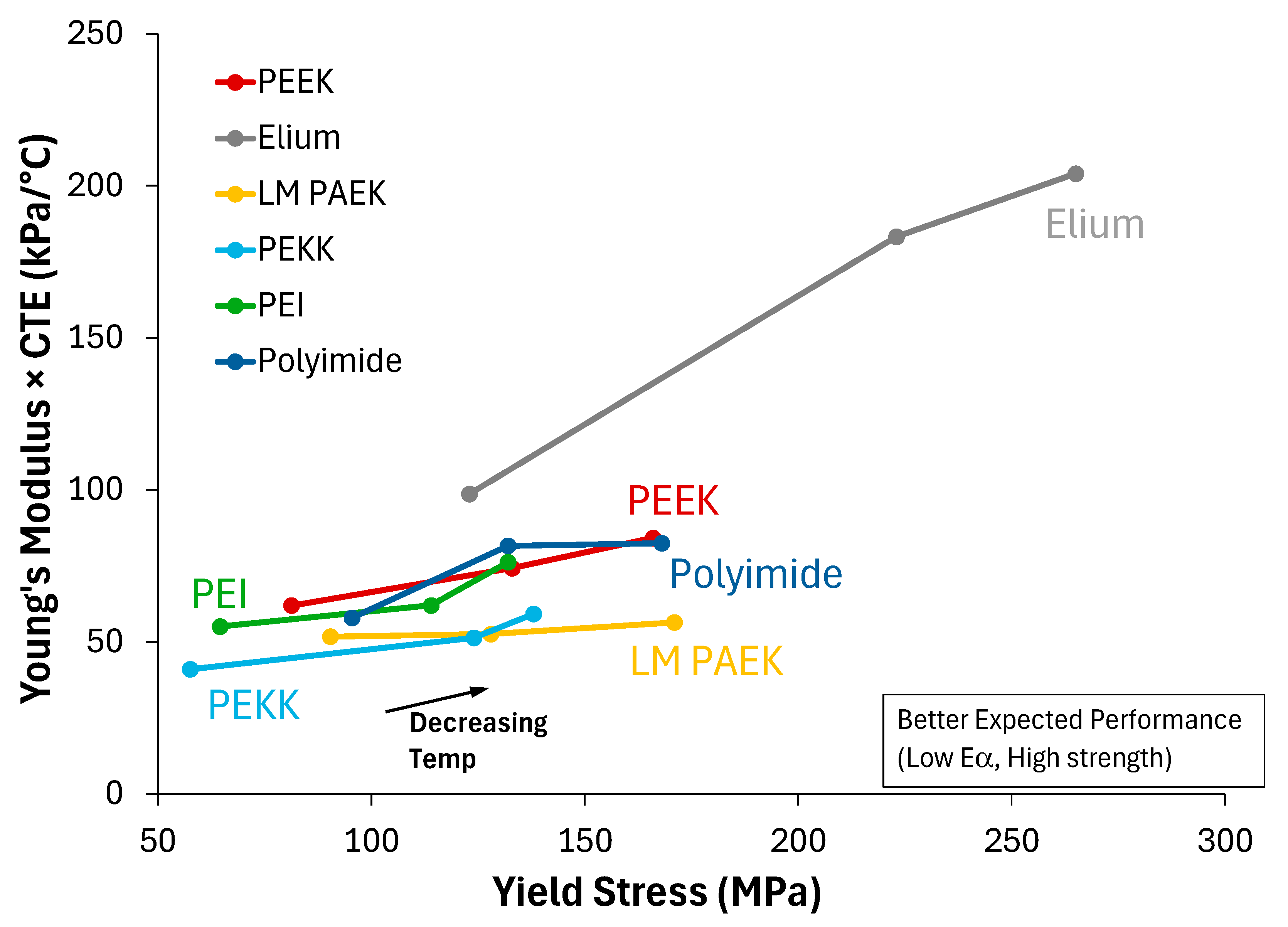 Figure 6. The best performing thermoplastics, LM-PAEK and PEKK, have the lowest E·α, with strengths reasonably close to the other thermoplastics (aside from Elium). PEKK’s strength at the lowest temperature (furthest point to the right in its curve) is quite a bit lower compared to LM-PAEK, and even PEEK and polyimide, but it has a much lower E·α compared to these two lower-performing thermoplastics. Examining PEI, which, recall, had the worst performance of all the thermoplastics studied, it has the lowest strength at −253 °C (furthest point to the right in its curve), and it also has a significant jump in E·α from −183 to −253 °C. However, given its poor performance, with TPC matrix microcracking during the cooldown, one might expect it to appear further from the other thermoplastics in the plot shown in