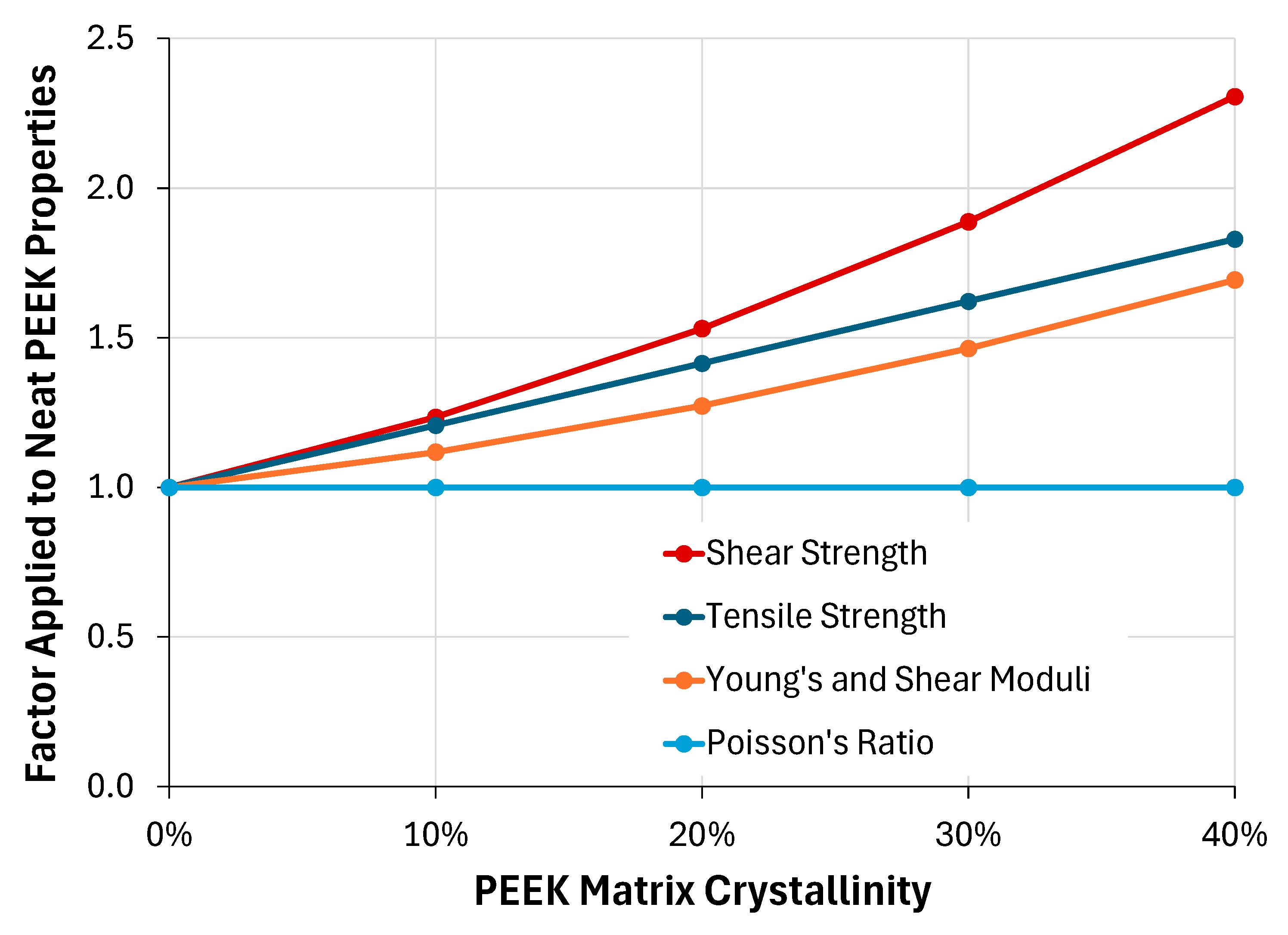 Figure 2). To compare with test data from the literature, in which the PEEK matrix is typically semi-crystalline, estimates of the PEEK matrix properties as a function of crystallinity percentage (by volume) were first performed. Towards this end, the empirical equations presented by Talbott et al. [