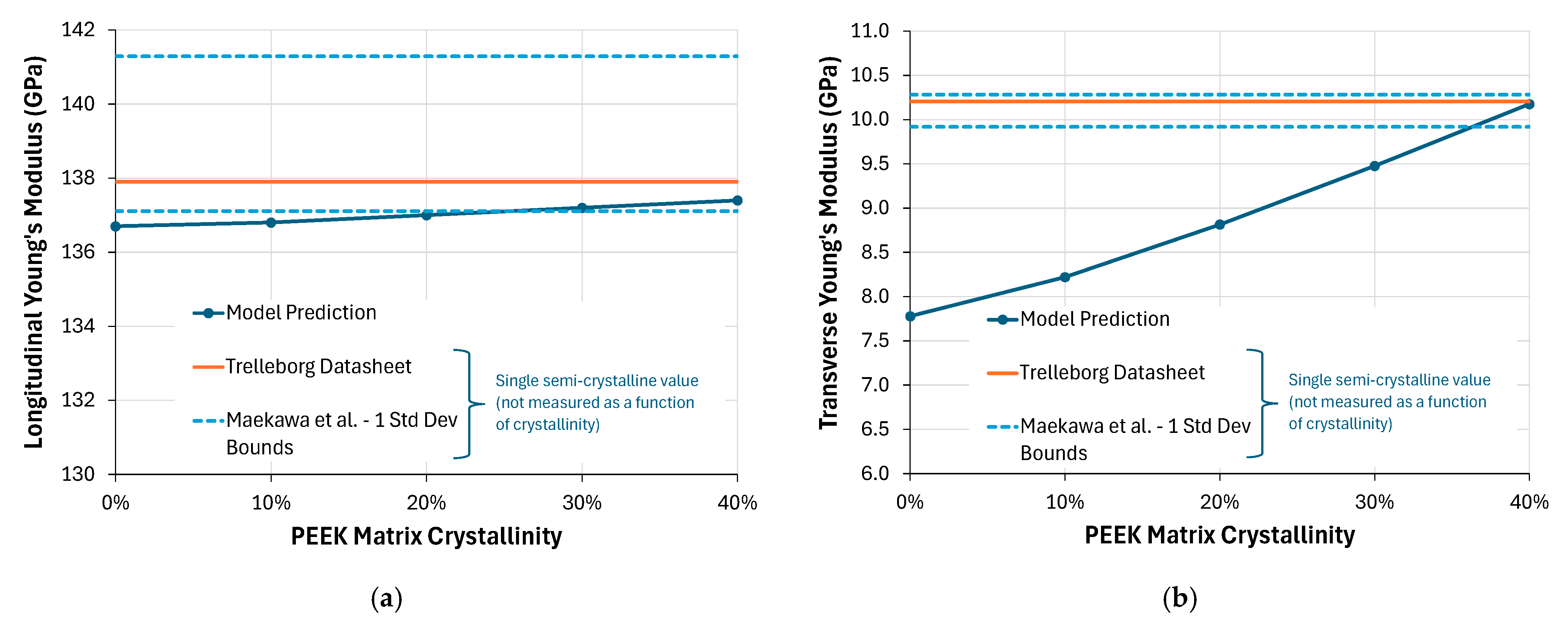 Figure 12b,d suggest that treating the PEEK matrix as amorphous rather than semi-crystalline has resulted in underpredicting the AS4/PEEK transverse Young’s modulus and strength by 23% and 39%, respectively, compared to the mean values reported by Maekawa et al. [