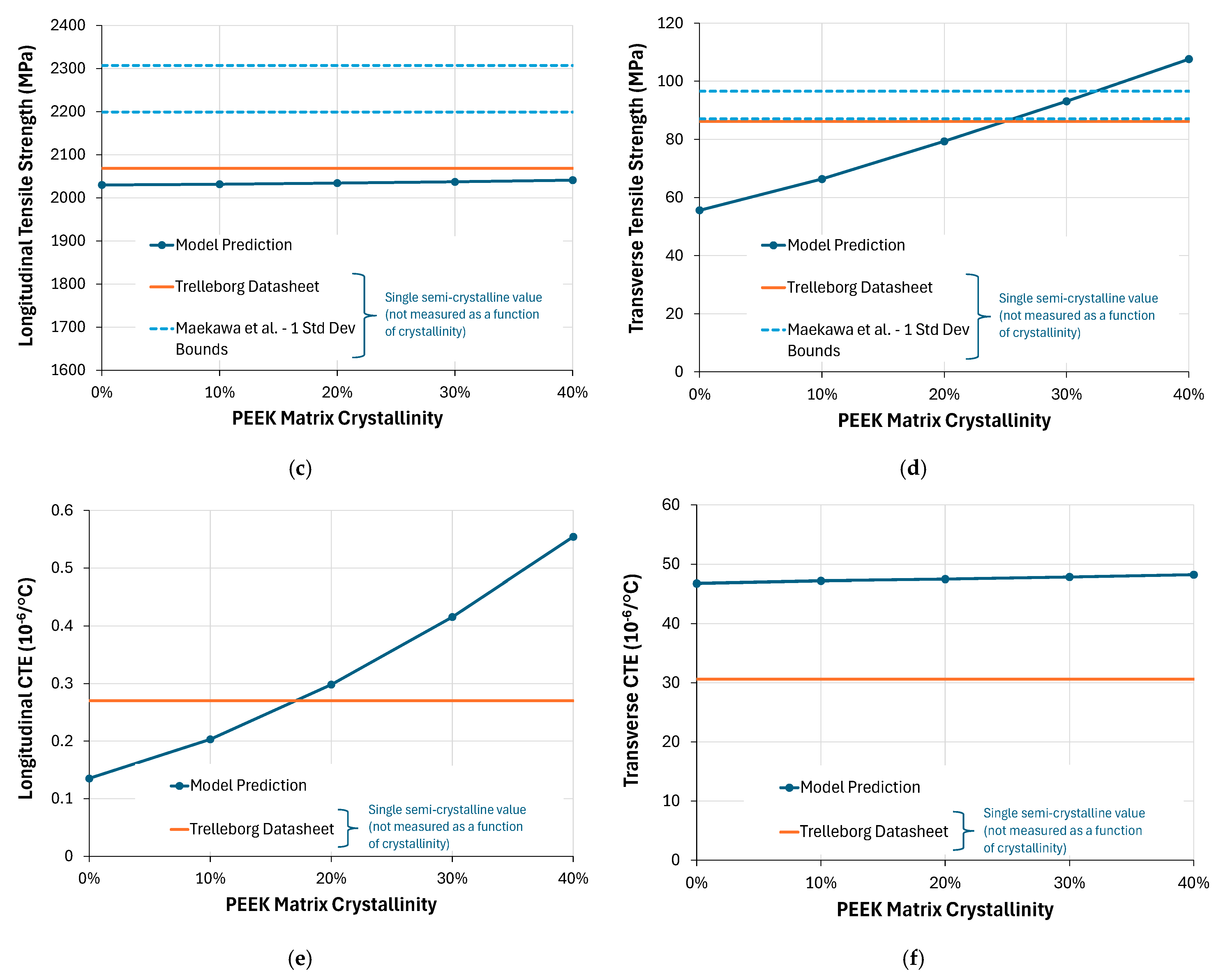 Figure 12b,d) show a strong dependence on the PEEK degree of crystallinity. Further, at realistic PEEK crystallinities (~33%), the predictions agree quite well with the test data, with the predicted transverse Young’s modulus slightly underpredicted and the transverse tensile strength slightly overpredicted.