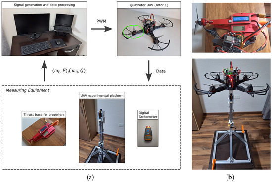 Quadrotor experimental tests: (a) Block diagram for data acquisition. (b) Quadrotor under thrust (top image) and torque (bottom image) tests.