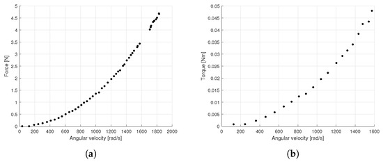 In parallel with each force and torque test, a digital tachometer is used to measure the RPM of the rotor. The information provided by the tachometer helps to match the force and torque data with their corresponding rotational speeds, according to each test carried out with the thrust base and UAV experimental platform, respectively. The results of both sets of experiments, that is, force and torque tests, are shown in Figure 2. Note that the rotor angular velocity is presented in rad/s for ease of data handling. On the other hand, the characteristics of the measuring equipment used to perform the experimental tests are presented in Table 1.