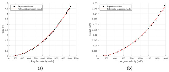 correspond to the propeller thrust and torque coefficients, respectively. Recall that all summations are from through for the thrust coefficient and from through for the torque coefficient, according to the number of experimental tests carried out on each set of data. The comparison between the experimental data and the polynomial regression models of the quadrotor propellers is shown in Figure 8.