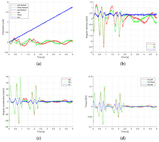 Quadrotor attitude control simulation results: (a) Orientation. (b) Velocity. (c) Acceleration. (d) Torque.