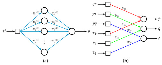 The proposed neural network architecture to estimate the quadrotor inertial parameters (, , and ) is shown in Figure 10b. Note that it is a single-layer neural network which receives six inputs that represent the quadrotor angular velocities multiplications (, , and ) and the actuators torques (, , and ) and outputs the angular accelerations (, , and ). Also note that for this scenario, not all of the neural network nodes are connected to each other, thus being known as a Sparse Neural Network (SNN). SNNs are neural architectures in which not all of the neurons are connected to each other. In addition, these types of ANNs have proven to be an effective solution to reduce computation and memory demands [29]. However, the fact that the proposed neural network is decided as SNN is not related to computation and memory demands, but rather because not all of the input variables are related to each output variable, according to the quadrotor mathematical model.