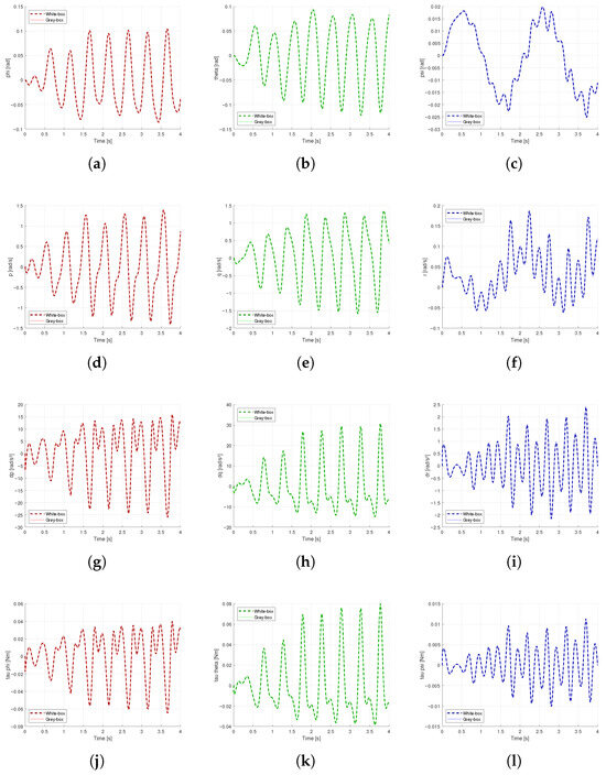 Comparison of quadrotor simulation 2 output variables between white-box and grey-box parameters: (a) . (b) . (c) . (d) p. (e) q. (f) r. (g) . (h) . (i) . (j) . (k) . (l) .