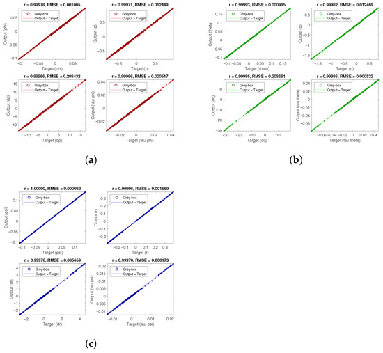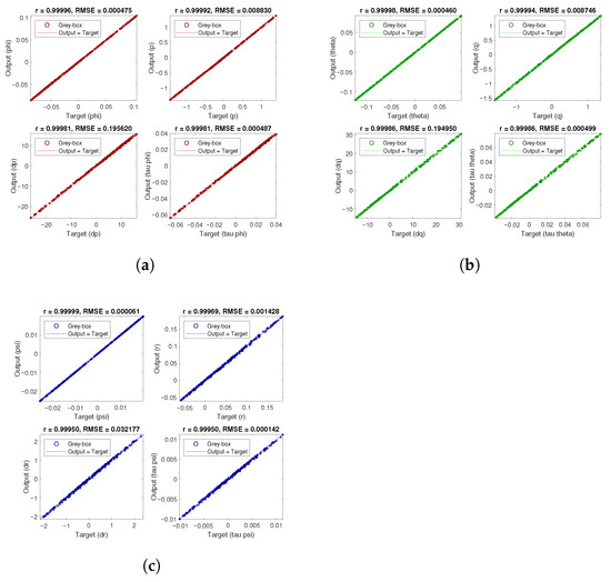 The results from simulation 1 and simulation 2 are presented in Figure 15 and Figure 16, respectively. Note that based on the quadrotor response, the white-box and grey-box results are closely aligned in all of the output variables, showing high accuracy. On the other hand, Figure 17 and Figure 18 show the correlations between white-box and grey-box results from simulation 1 and simulation 2, respectively, in all three axes where in all cases the outputs have a linear trend and closely match the targets, meaning high precision and accuracy. Lastly, the correlation results from both simulations are summarized in Table 7. Pearson r and Root Mean Square Error (RMSE) between white-box and grey-box results determine that the estimated aerodynamic and inertial parameters produce accurate and precise results in the quadrotor dynamics response.