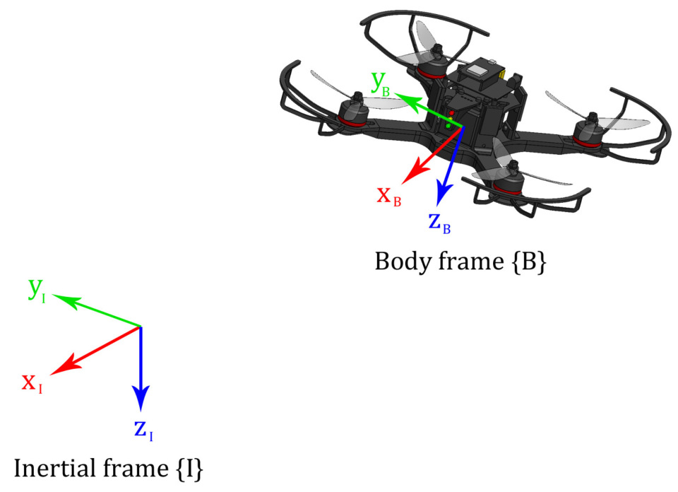 and a body frame attached to the center of gravity of the quadrotor represented as