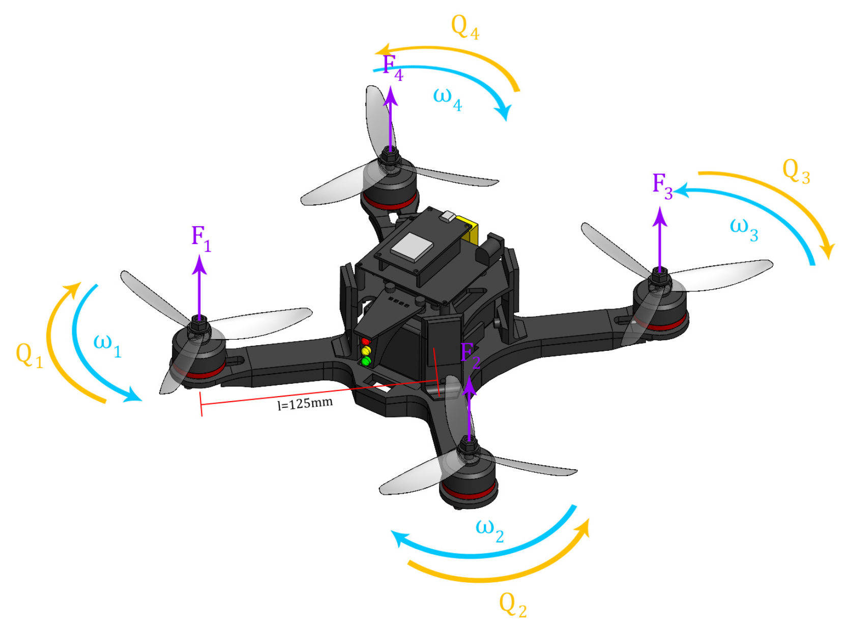 The quadrotor vertical component of thrust in the body frame is expressed as where indicates the force exerted by each motor. Both forces and torques are expressed as a function of the angular velocity of the motors. represent the force and the reactive torque of the motor, where is the angular velocity and and are the thrust and torque coefficients respectively.
