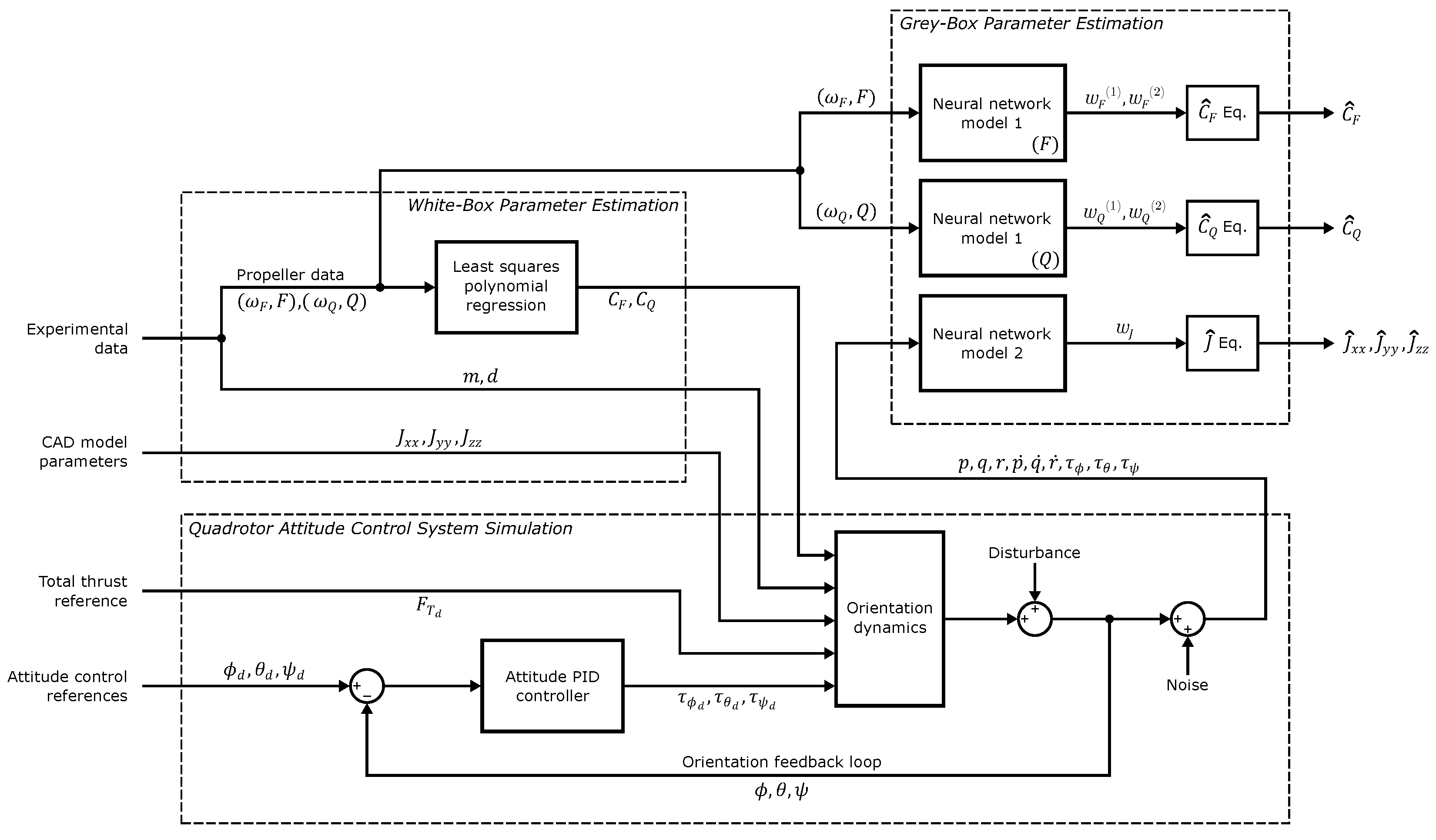 Section 2. On the other hand, the simulation data is obtained from a quadrotor dynamics simulation, which outputs angular velocities, angular accelerations, and torque data. Note that the dynamics simulation considers the quadrotor parameters estimated by means of the white-box parameter estimation process. Therefore, the parameters estimated by means of the white-box approach are considered as true values and these are referred to as