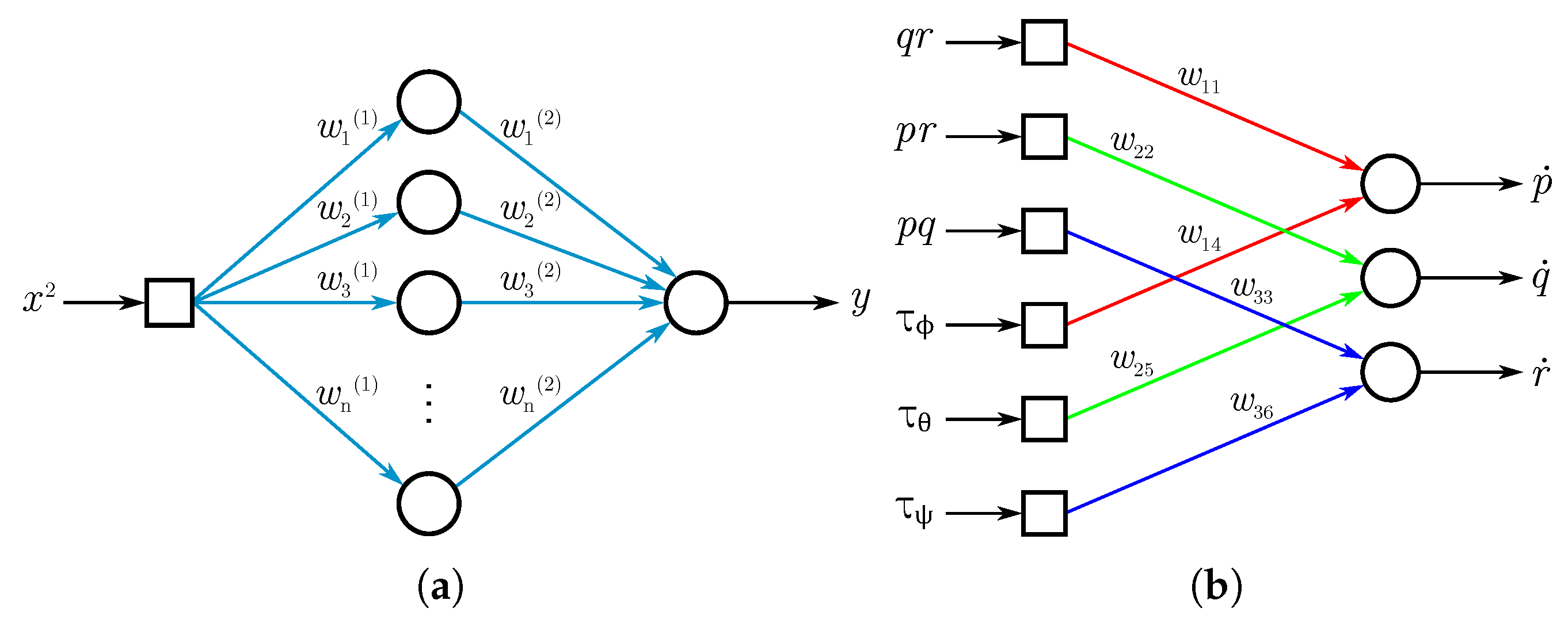 Figure 10b. Note that it is a single-layer neural network which receives six inputs that represent the quadrotor angular velocities multiplications (