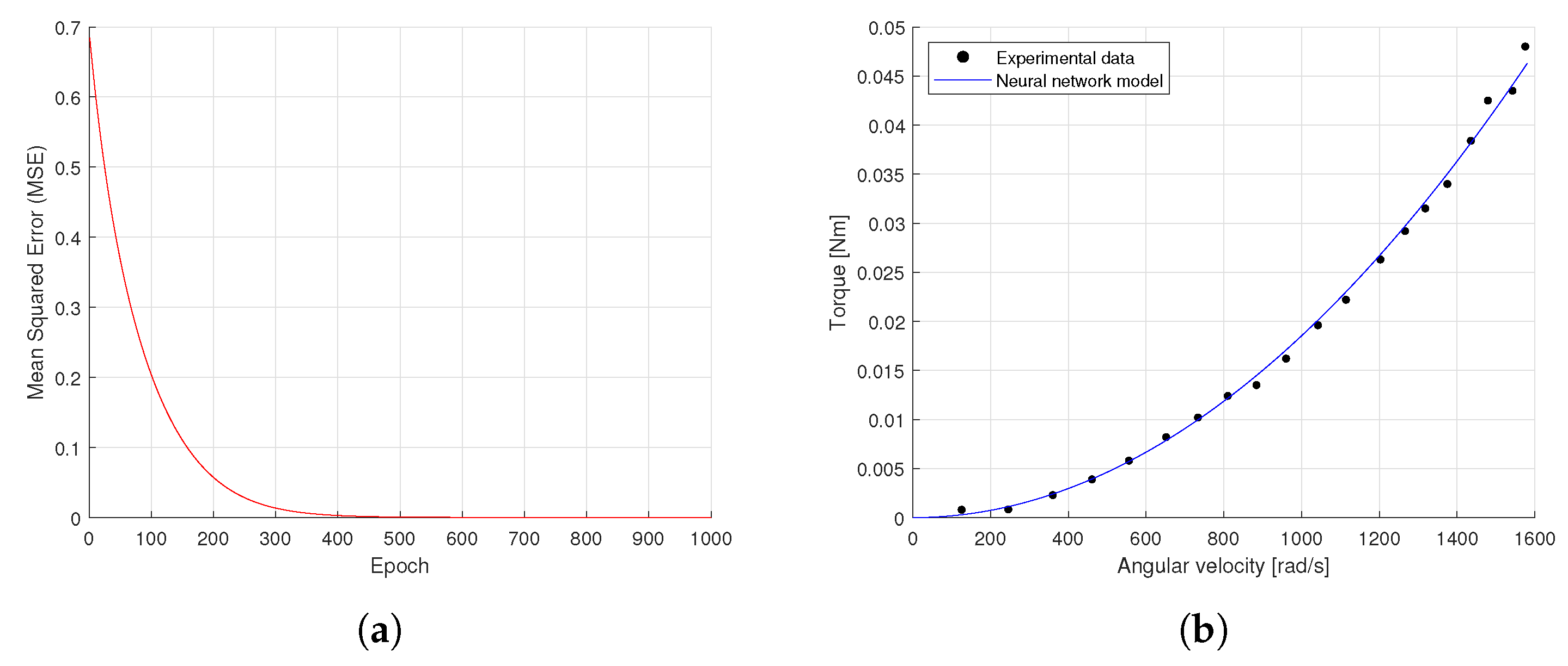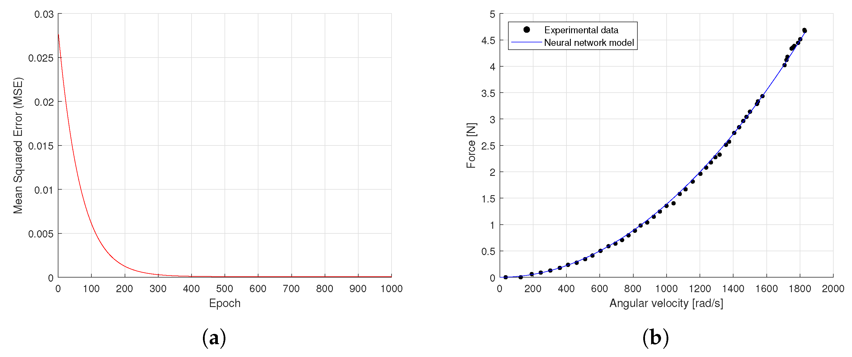 Using the thrust and torque experimental data, two neural networks are trained as previously outlined, considering four neurons in the hidden layer of each. Training for thrust data has taken approximately 0.2431 s for 2000 epochs on the dataset of 50 samples, using a batch size of 50. For torque data, training has taken around 0.0952 s for 2000 epochs on the dataset of 20 samples, using a batch size of 20.
