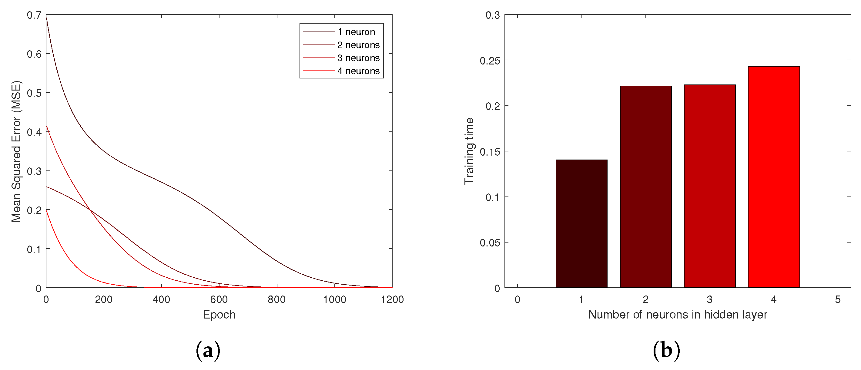 Figure 13a. Note that as the number of neurons increases, the Mean Squared Error (MSE) converges to zero requiring fewer training epochs. This is a general behavior since the initial conditions of the weights (which are randomly assigned) also affect the learning process. Although it is currently confusing and difficult to determine the number of hidden layers and the number of neurons in each hidden layer, there have been efforts to determine these values based on the number of training examples and the complexity of the classification, as addressed in [