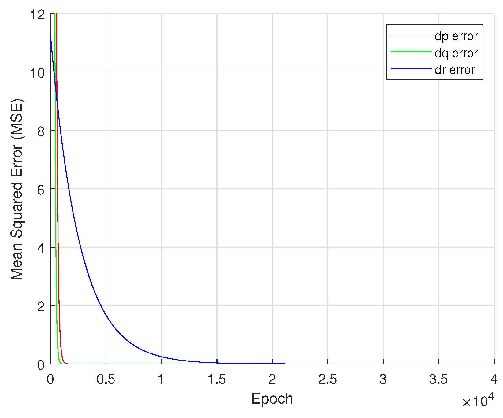Training of the neural network is carried out using the data from the quadrotor attitude control simulation. The generalized delta rule is applied as the learning algorithm in order to minimize the cost function. Training has taken approximately 2.1454 s for 40,000 epochs on the dataset of 2063 samples, using a batch size of 2063.