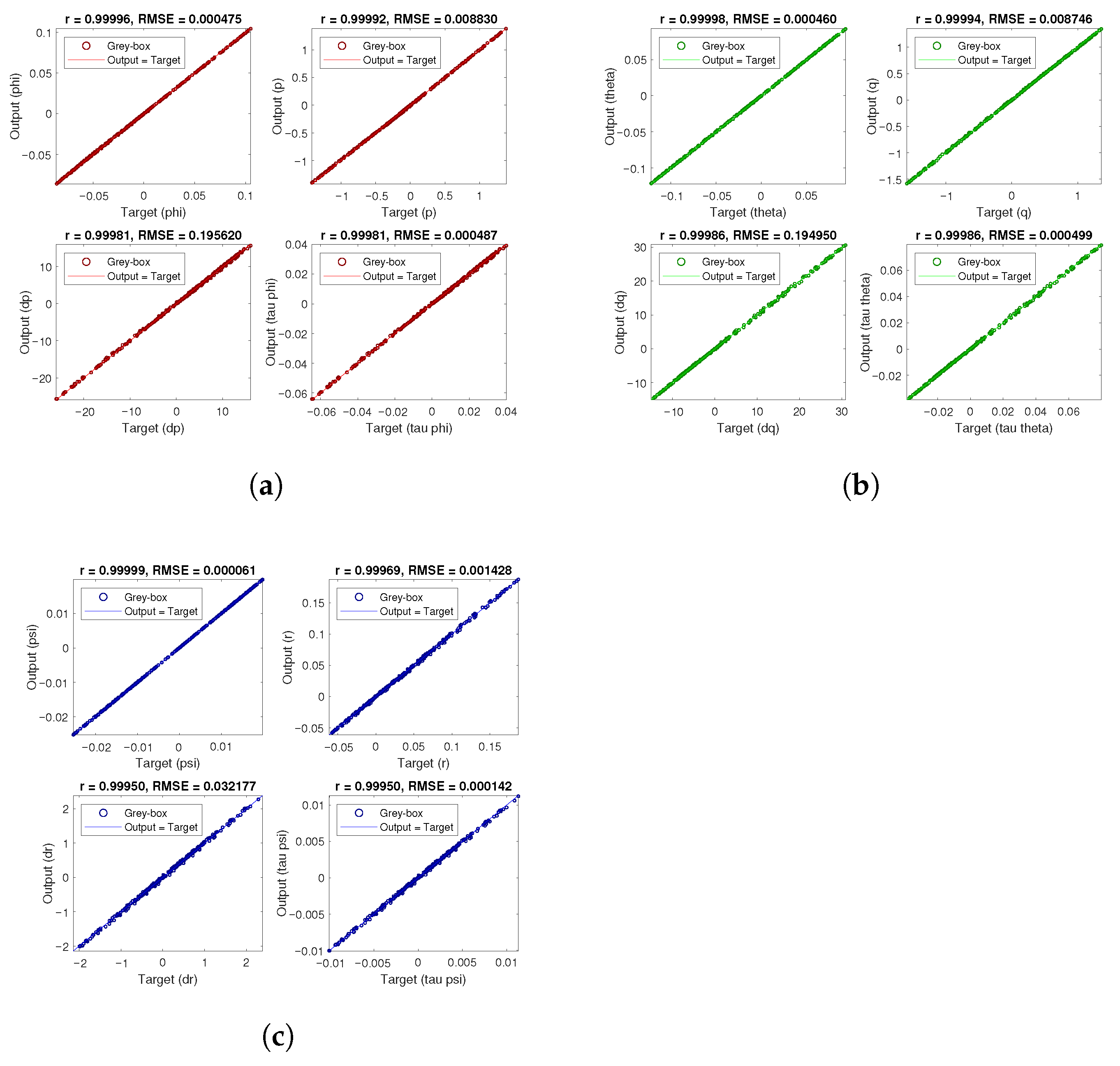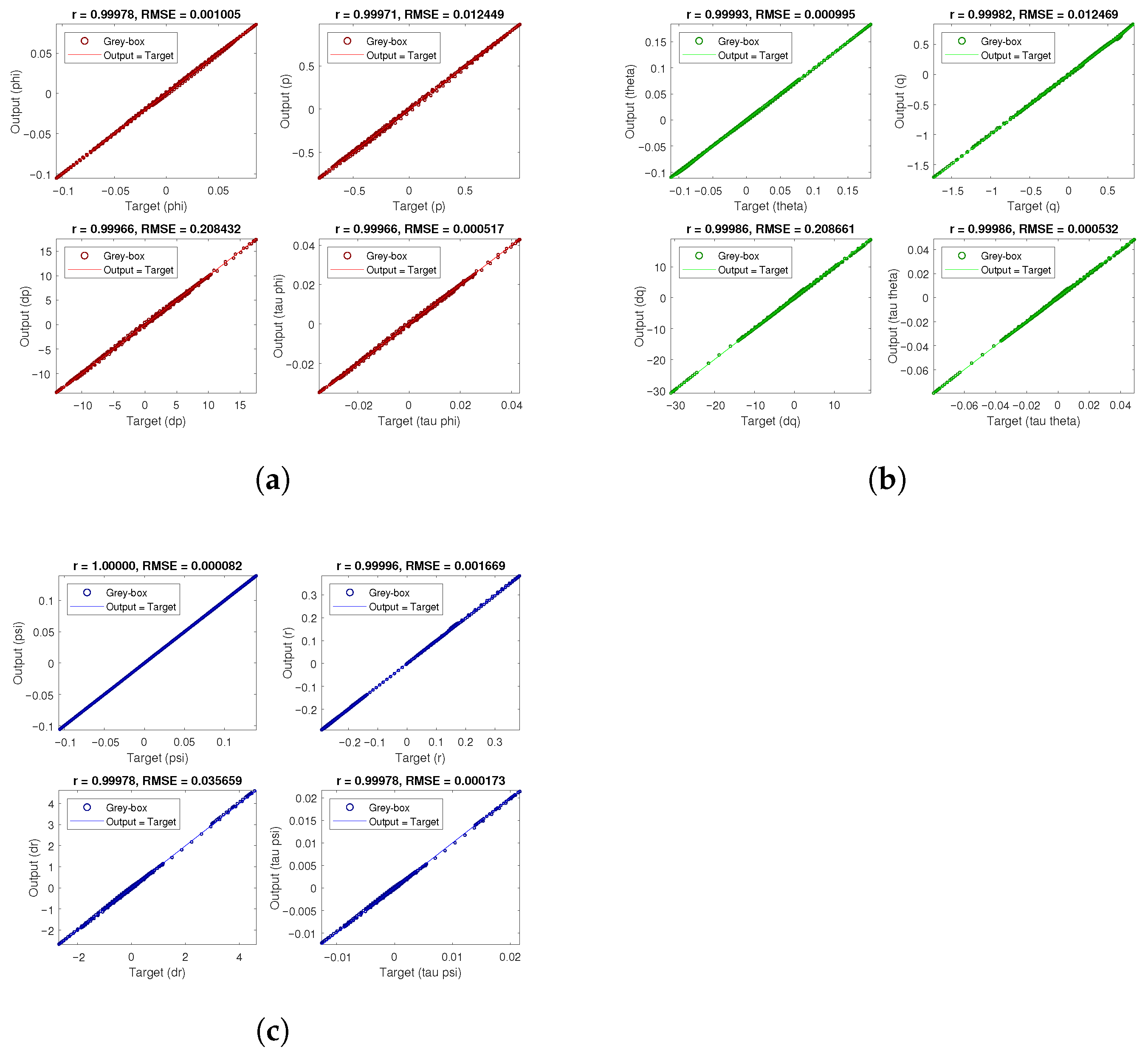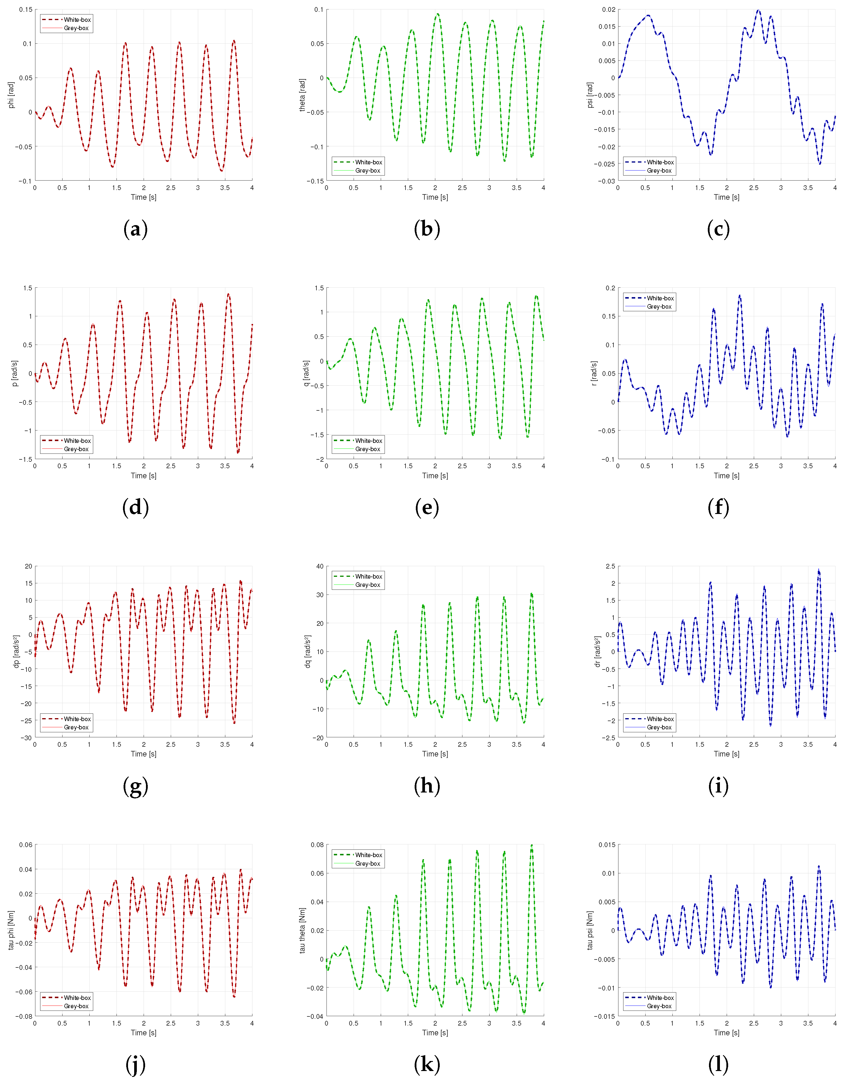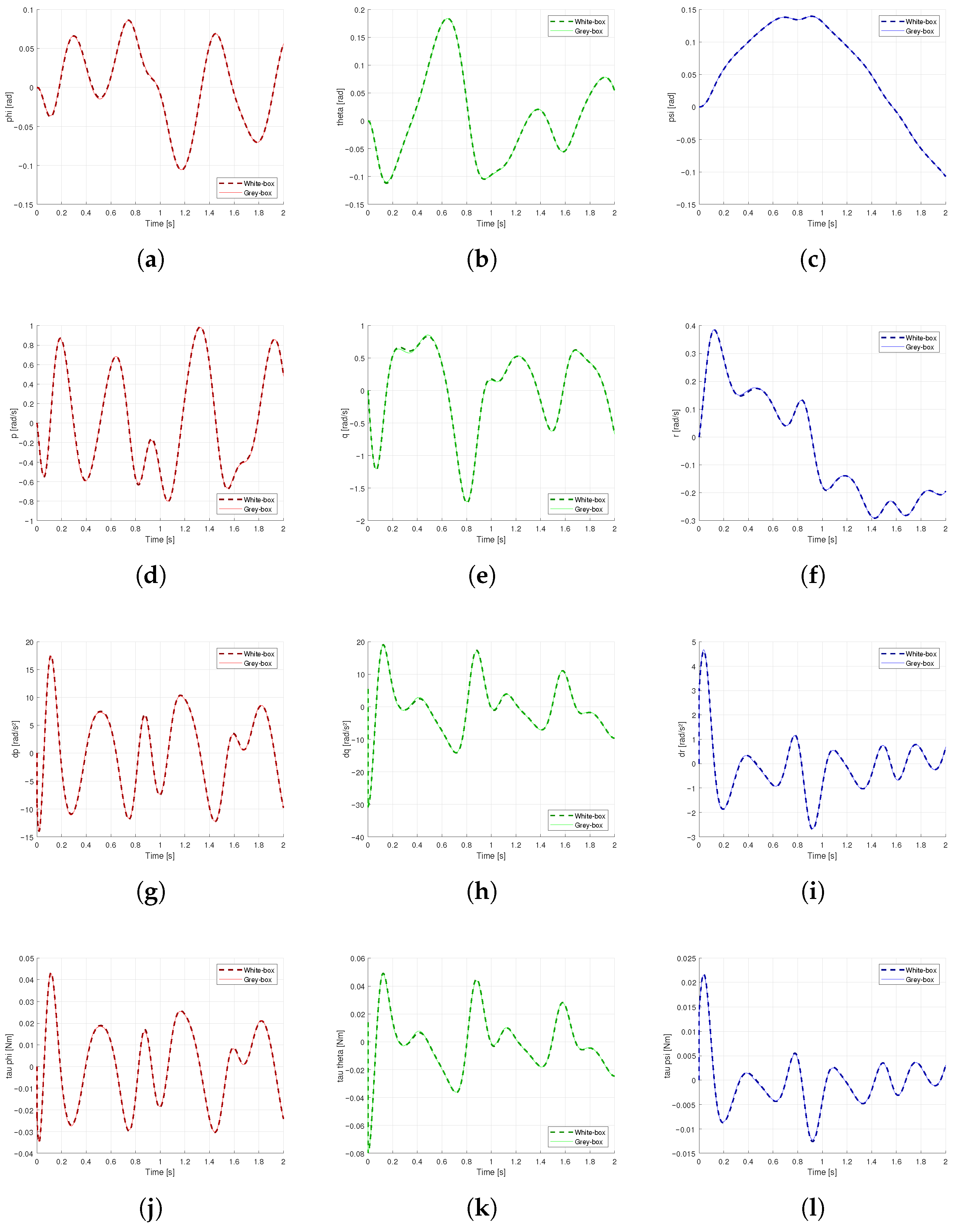 Figure 16, respectively. Note that based on the quadrotor response, the white-box and grey-box results are closely aligned in all of the output variables, showing high accuracy. On the other hand,