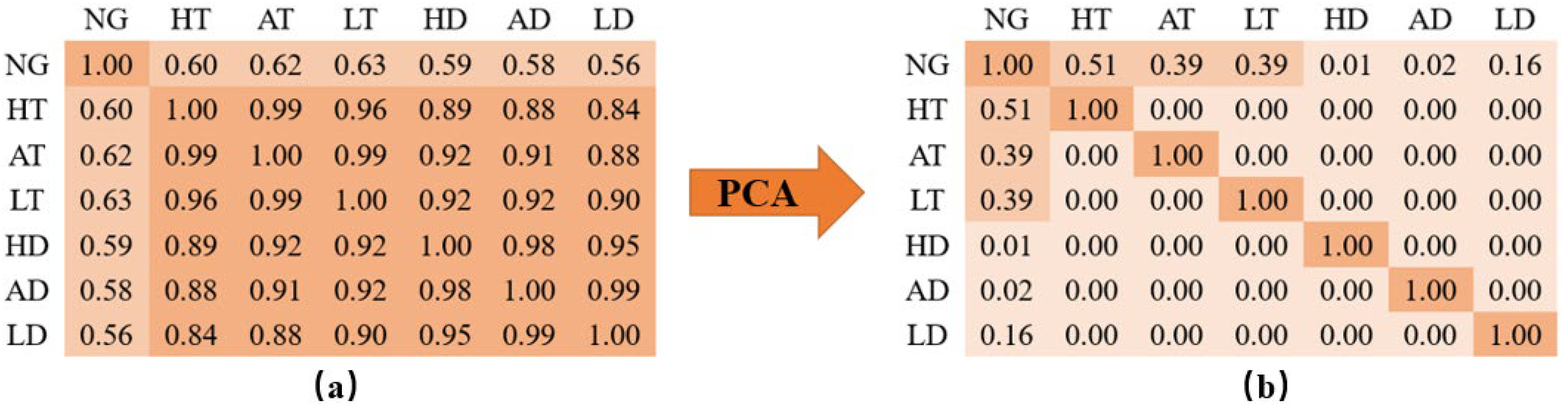 Figure 1b, which shows the principal components obtained by standard PCA, all components are uncorrelated variables, effectively reducing variable correlation and redundant input.