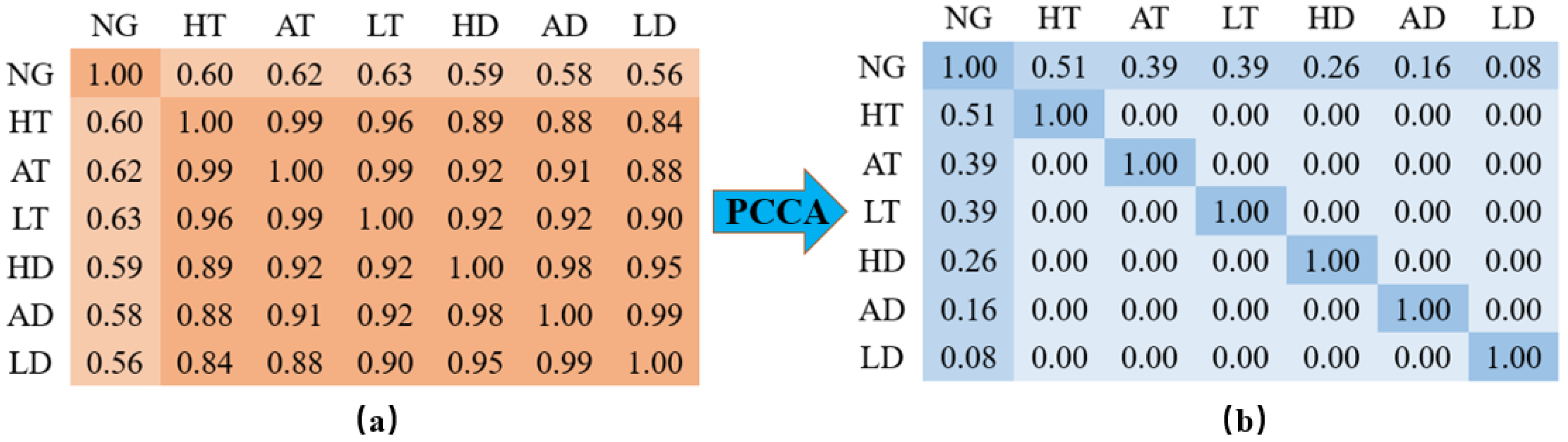 The PCCA algorithm also comprises three stages: mean-centering and standardization, eigendecomposition, and reconstruction. The first two stages are identical to those of the standard PCA algorithm. However, in the reconstruction stage, after the eigenvector matrix U is obtained from eigendecomposition, a principal component matrix is formed. This matrix contains