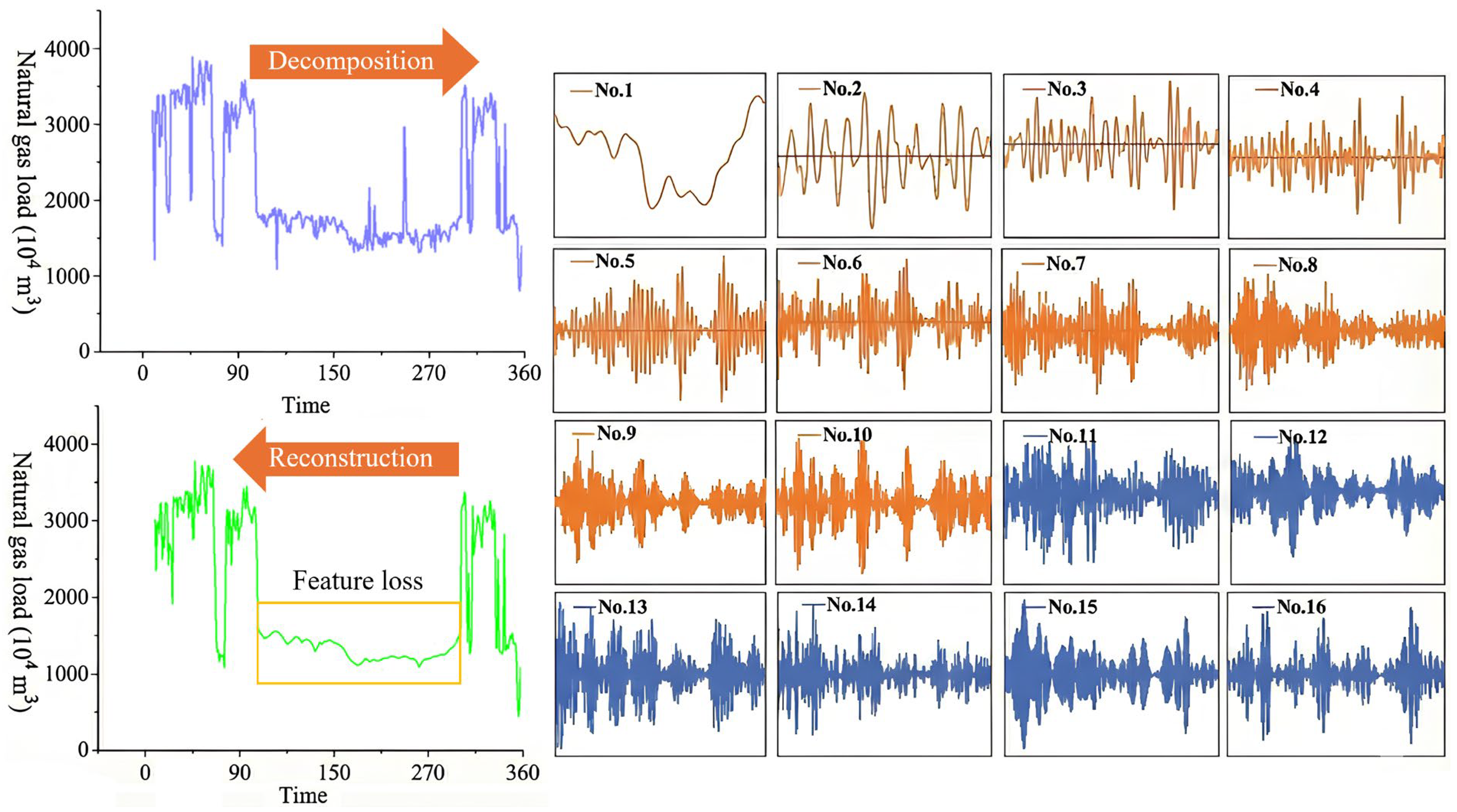 Figure 3 illustrates the denoising results of applying the original SSA algorithm to the same natural gas load data from the large city in Northern China (as used in subsequent experiments). The results clearly demonstrate a significant problem of data feature loss.