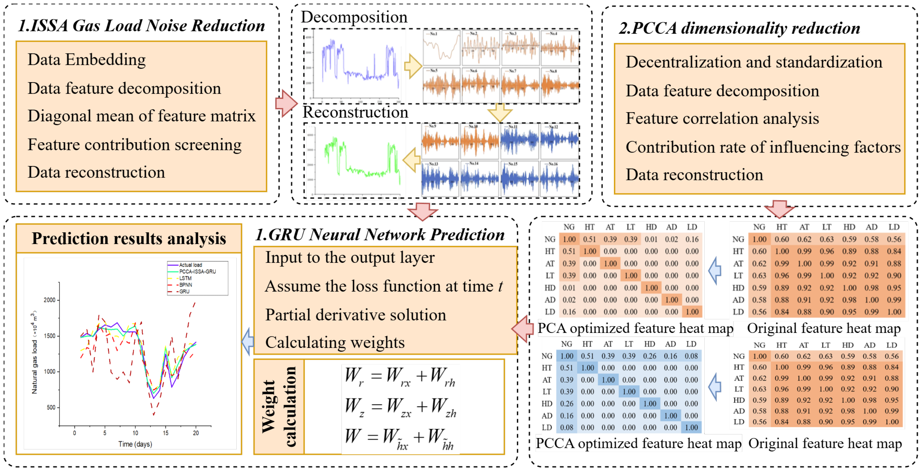 By integrating the improved dimensionality reduction and denoising methods with the GRU network, we establish a novel hybrid model for short-term gas load forecasting, named the PCCA-ISSA-GRU model. The specific workflow of this model is illustrated in
