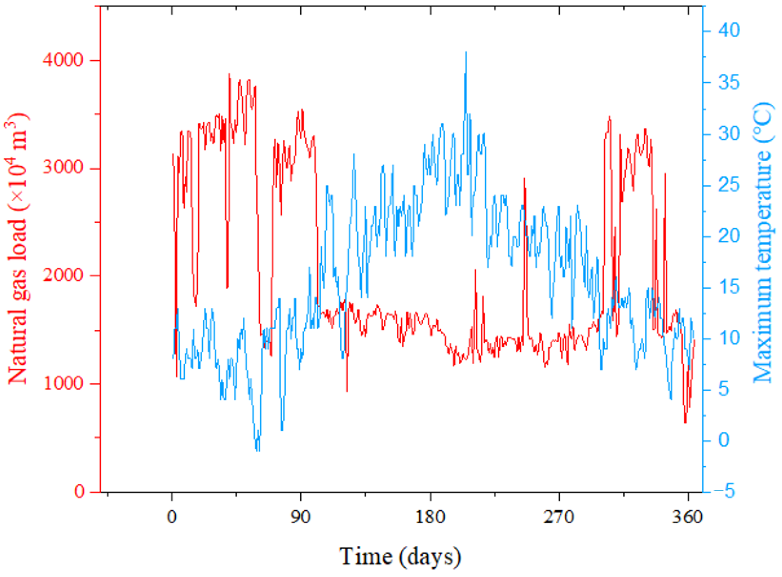Figure 12 illustrates the correlation between load and maximum temperature. The horizontal and vertical axes represent time, temperature, and gas load value, respectively. As can be observed from the figure, the lower the temperature, the higher the gas load. As the temperature rises, the load value decreases, demonstrating a clear negative correlation between temperature and load.