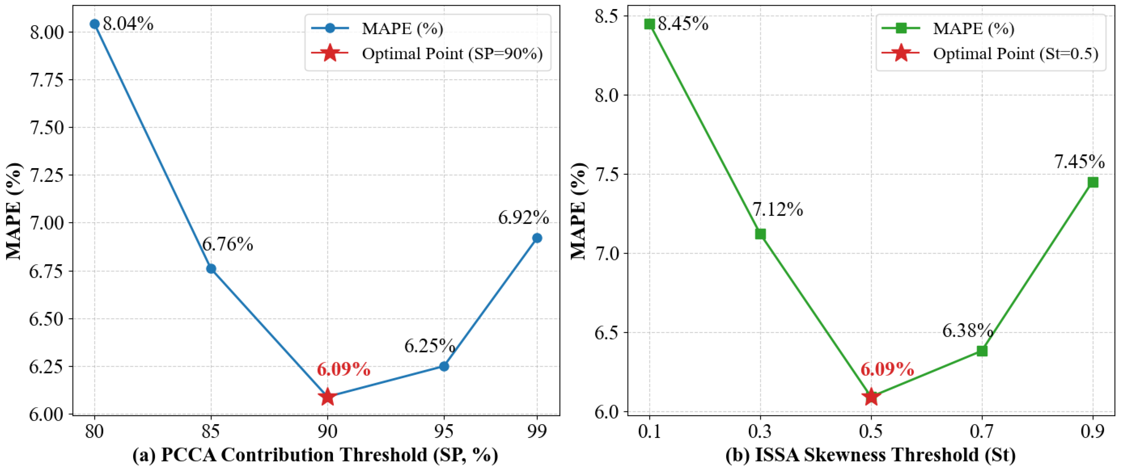 Residual Noise (St > 0.5): When the threshold is set too high (e.g., 0.9), the screening criteria become too lenient. The algorithm fails to effectively identify non-Gaussian random noise, allowing significant interference signals to remain in the input sequence. This reduces the learning efficiency of the GRU, causing MAPE to rise to 7.45%.