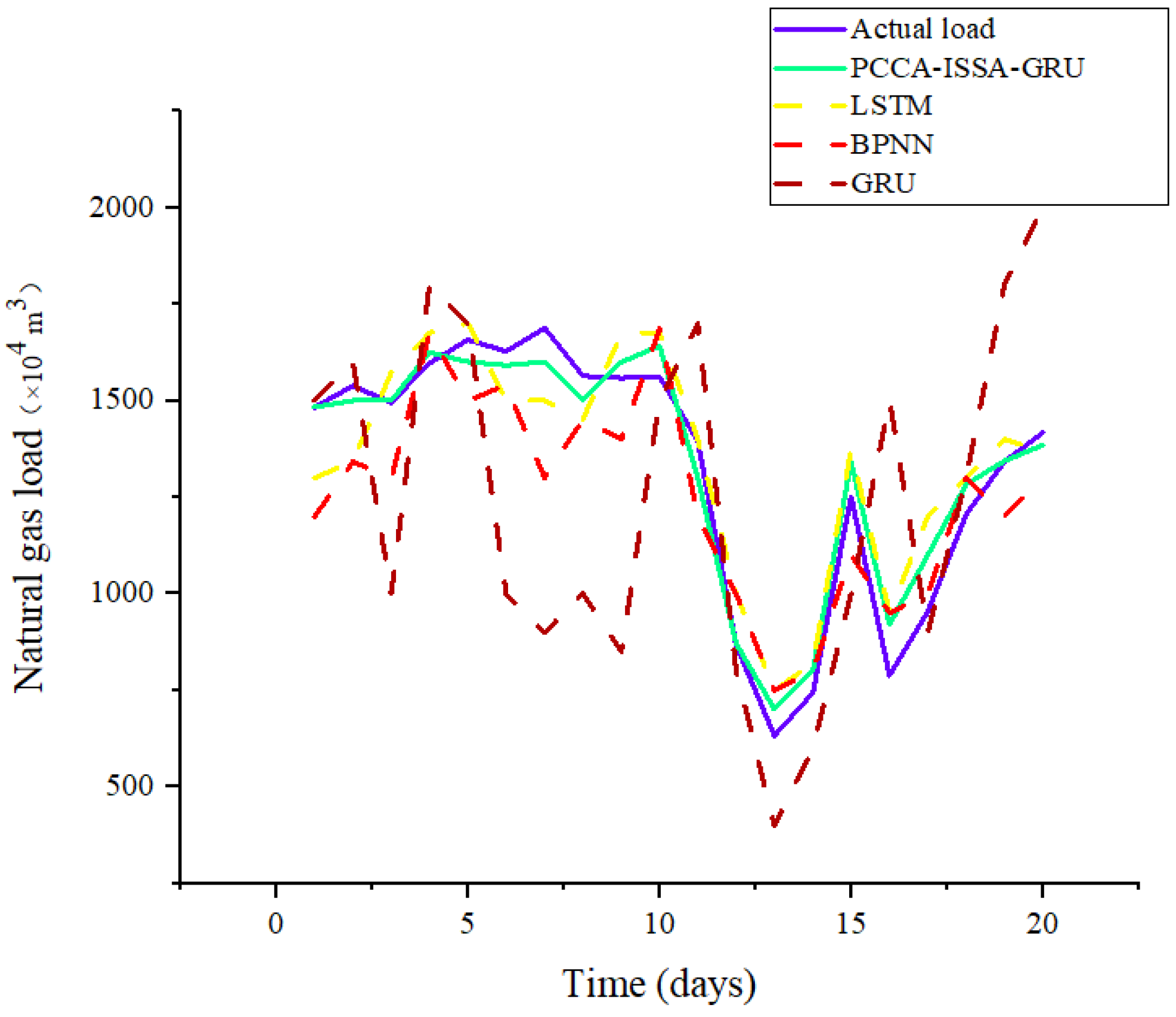 After analyzing the load data, the experiment was set with a forecast horizon of 20 days. The hybrid algorithm (PCCA-ISSA-GRU) applied the improved PCCA algorithm for dimensionality reduction in influencing factors and the improved ISSA algorithm for data cleansing to forecast the load data. A comparative analysis was conducted against the prediction results of the LSTM, BPNN, and GRU models. The comparison results are shown in
