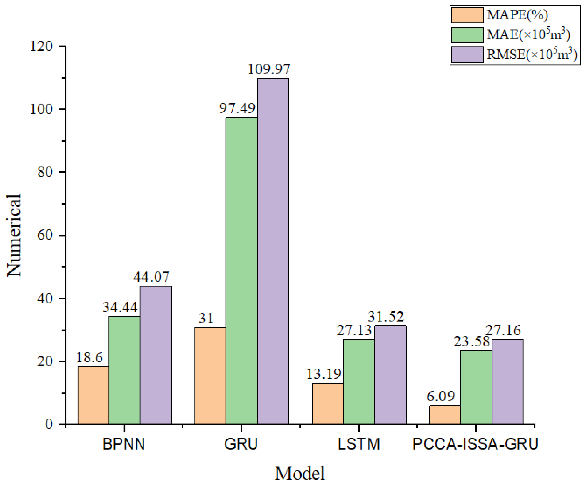As indicated by the prediction results, in the short-term forecasting scenario, the prediction accuracy of the PCCA-ISSA-GRU hybrid model is significantly higher than that of the traditional models, exhibiting the lowest MAPE, MAE, and RMSE.