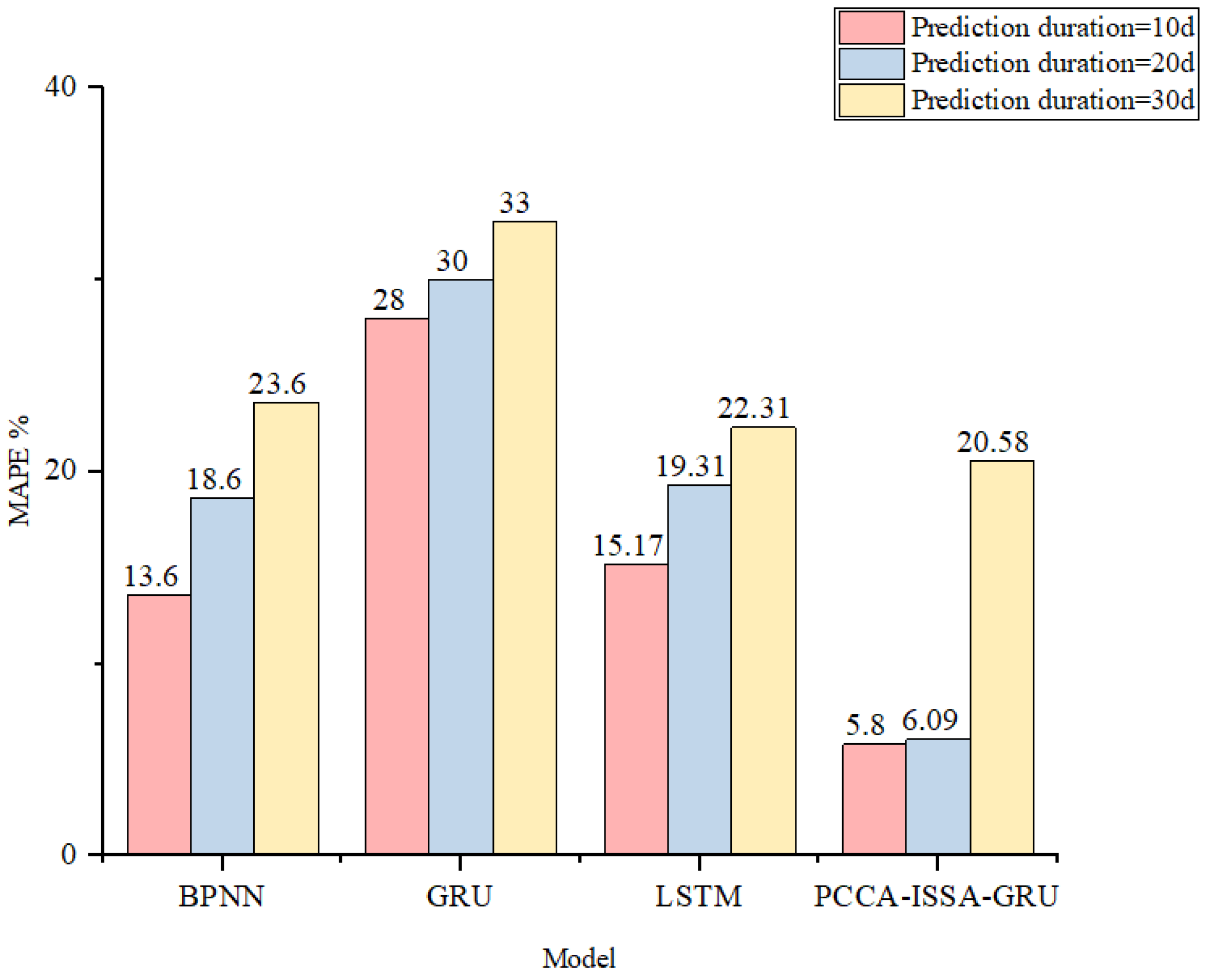 p-value is 0.0285 (<0.05). This statistically confirms that although the lead of PCCA-ISSA-GRU in terms of MAPE for the 10–20-day forecast is relatively small (see