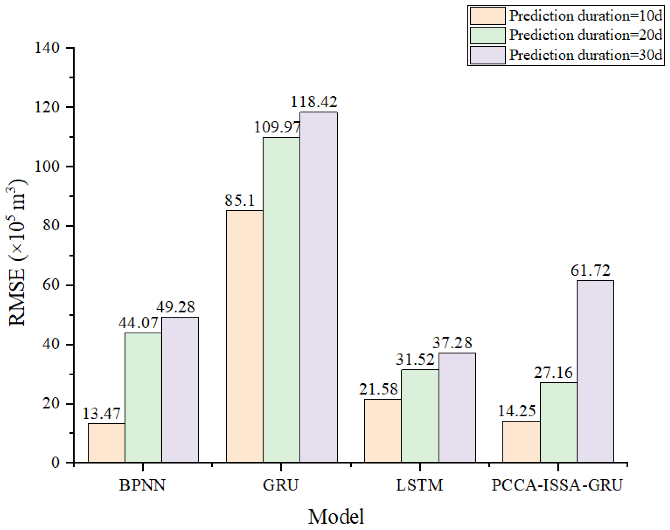 Additionally, when extending the forecast horizon from 20 days to 30 days, the MAPE value for the PCCA-ISSA-GRU hybrid model triples (a 3-fold increase) compared to its 20-day MAPE. In contrast, the MAPE increases for the BPNN, GRU, and LSTM models were 26.88%, 10.00%, and 15.54%, respectively. The results show that all three baseline models and the PCCA-ISSA-GRU hybrid model experience a surge in error. This is related to the construction of the neural networks; whether it is the BP error back-propagation mechanism or the LSTM/GRU long-term memory mechanism, the iterative (step-by-step) forecasting process inevitably leads to error accumulation, causing the prediction results to gradually deviate from the true values. Therefore, the proposed hybrid model is more suitable for short-term load forecasting analysis within a 20-day horizon.