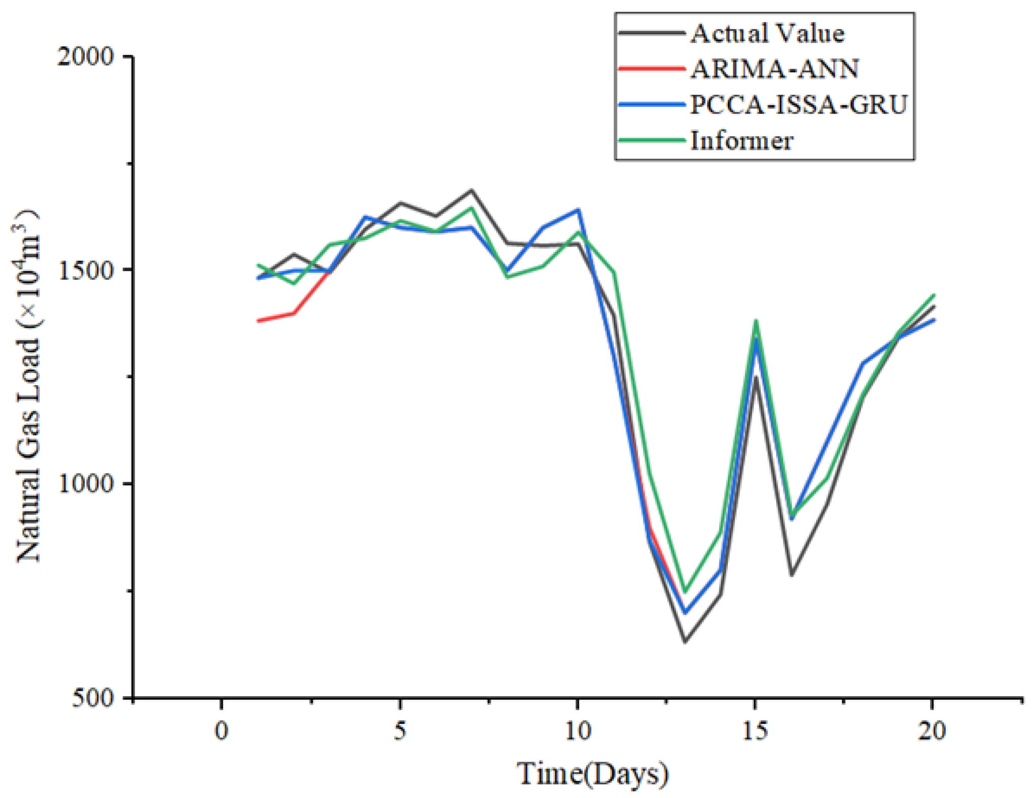 Figure 19, it can be concluded that the classic ARIMA-ANN hybrid model exhibits some volatility in the initial forecasting stage. The novel PCCA-ISSA-GRU hybrid forecasting model’s results are more stable, whereas the Informer model shows an advantage in the later forecasting stage. Overall, the PCCA-ISSA-GRU hybrid model achieves ideal prediction results in both the early and late stages.