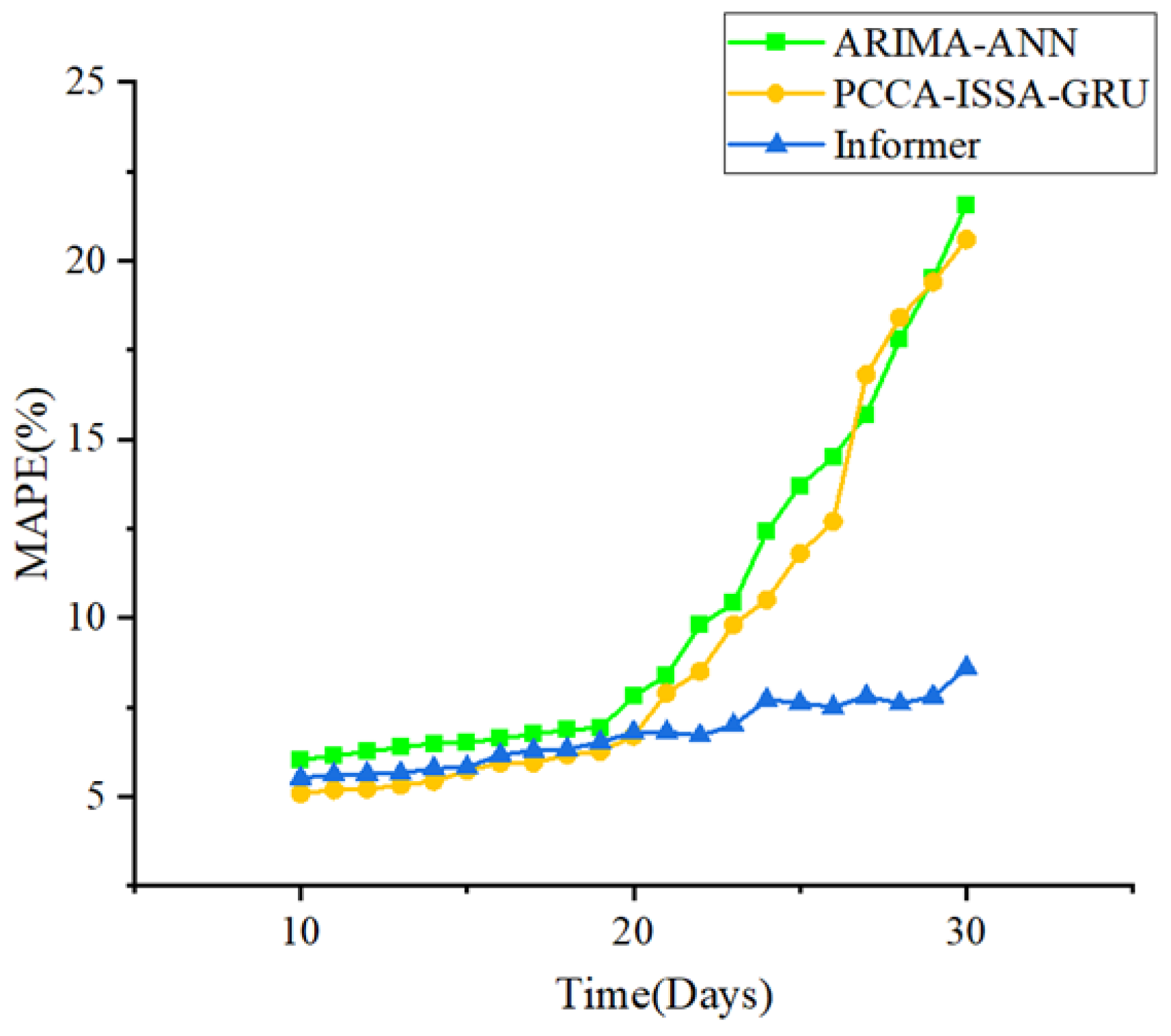 When the forecast horizon exceeds 20 days, the error of the PCCA-ISSA-GRU model increases significantly. This is attributed to the auto-regressive mechanism of its GRU core, which is prone to error accumulation in long-sequence forecasting, leading to a decline in accuracy in the later stages. In contrast, the Informer model, as the SOTA baseline, maintained high stability in its MAPE throughout the entire period. This is because it employs a Transformer-based direct multi-step prediction strategy, which circumvents the problem of error accumulation and demonstrates its architectural advantage in LSTF tasks.