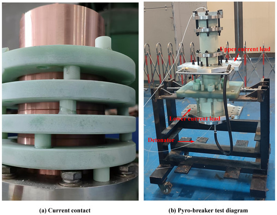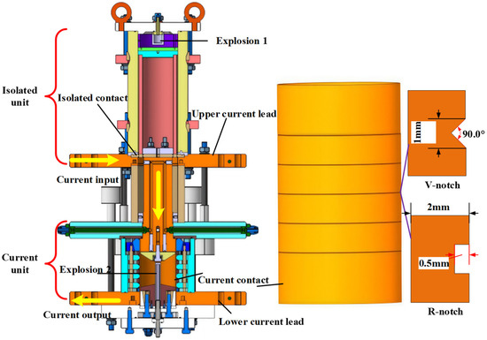 The structure of the pyro-breaker is illustrated in Figure 1. Functionally, it is divided into two main units: the isolated unit and the current unit. The isolated unit comprises the isolated contact, upper current lead, insulation cylinder, explosion chamber 1, and explosive tube 1. The current unit consists of the epoxy support plate, lower current lead, and cutting grid. Additionally, the current conversion unit includes an epoxy support plate, lower current lead, cutting grid, current contacts, explosion chamber 2, and explosive tube 2.
