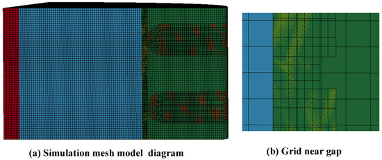The model adopts a unit system based on cm-g-µs, where the explosive, water, and air are represented using Eulerian meshes, while the copper and epoxy cutting grids are modeled using Lagrangian meshes. The grid model is shown in Figure 3, where the explosive grid size is 0.05 cm, the water grid size is 0.08 cm, the air grid size is 0.08 cm, the epoxy grid size is 0.05 cm, and the copper grid size is 0.025 cm. This approach allows for precise tracking of the deformation, displacement, and other mechanical responses of the solid components, accurately reflecting their physical behavior under explosive impact. A fluid-solid coupling algorithm is applied between the Eulerian and Lagrangian grids, enabling the bidirectional transfer of forces, displacements, and other physical quantities between the fluid and solid domains, ensuring a cohesive and coordinated simulation system. Fixed constraints are applied to the periphery of the epoxy cutting grid to effectively limit its displacement and simulate real-world working conditions. Non-reflective boundaries are set at the upper and peripheral ends of the air domain to prevent wave reflections from interfering with the simulation results. This study comprehensively simulates the entire dynamic process of the current unit, from the initial stable state through explosion impact, energy release, pressure transfer, and disconnection. Ultimately, the differences in fracture time and fracture spacing between the two contact structures are successfully revealed.